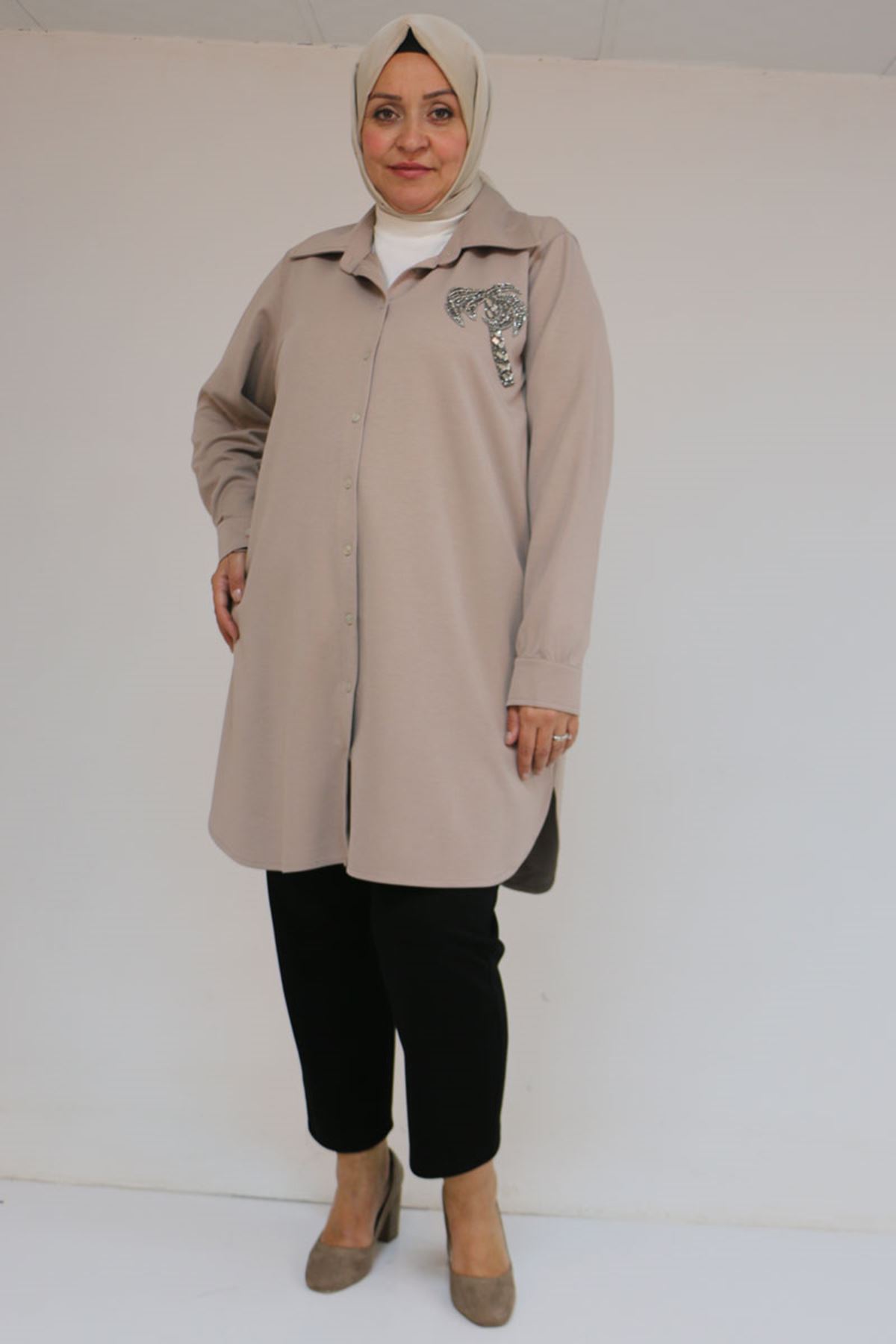 58126 Büyük Beden Düğmeli Aksesuar Detaylı Modal Tunik - Bej