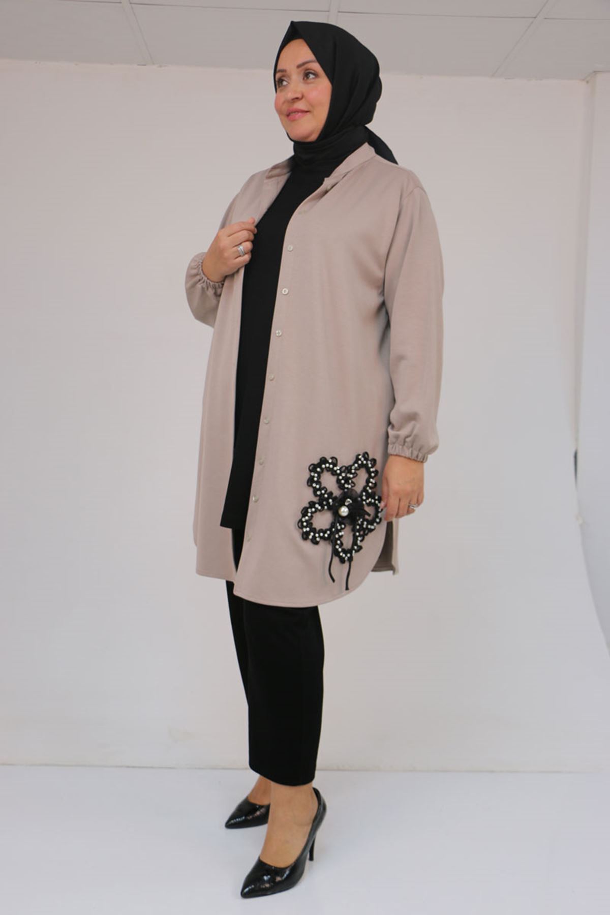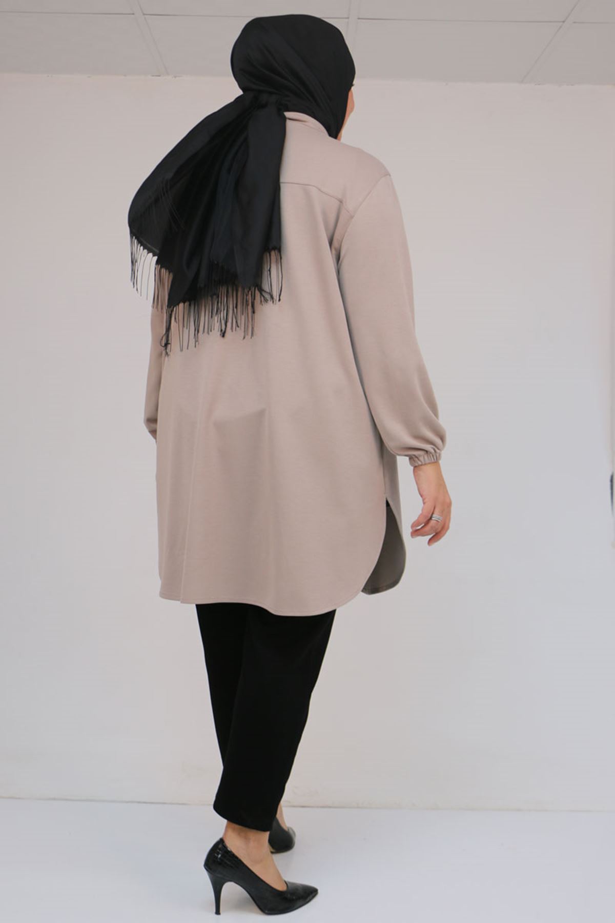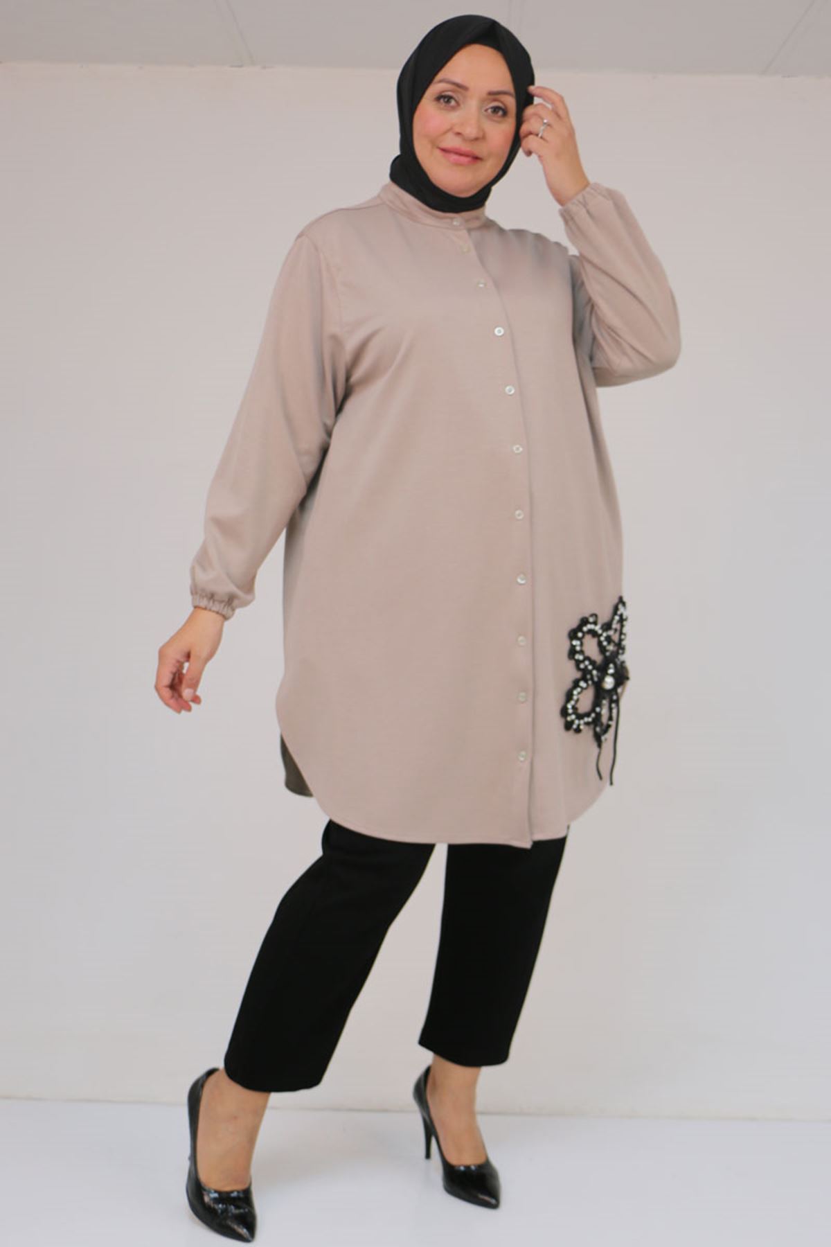 58127 Büyük Beden Hakim Yaka Aksesuar Detaylı Modal Tunik - Bej
