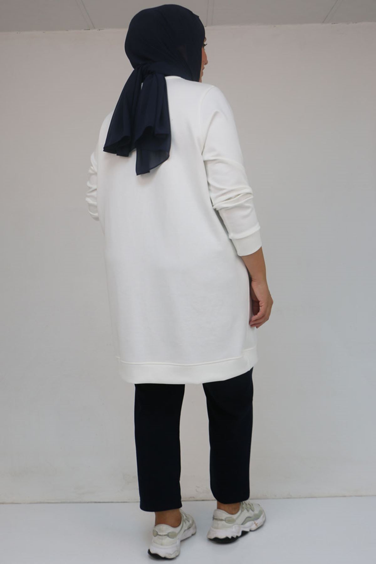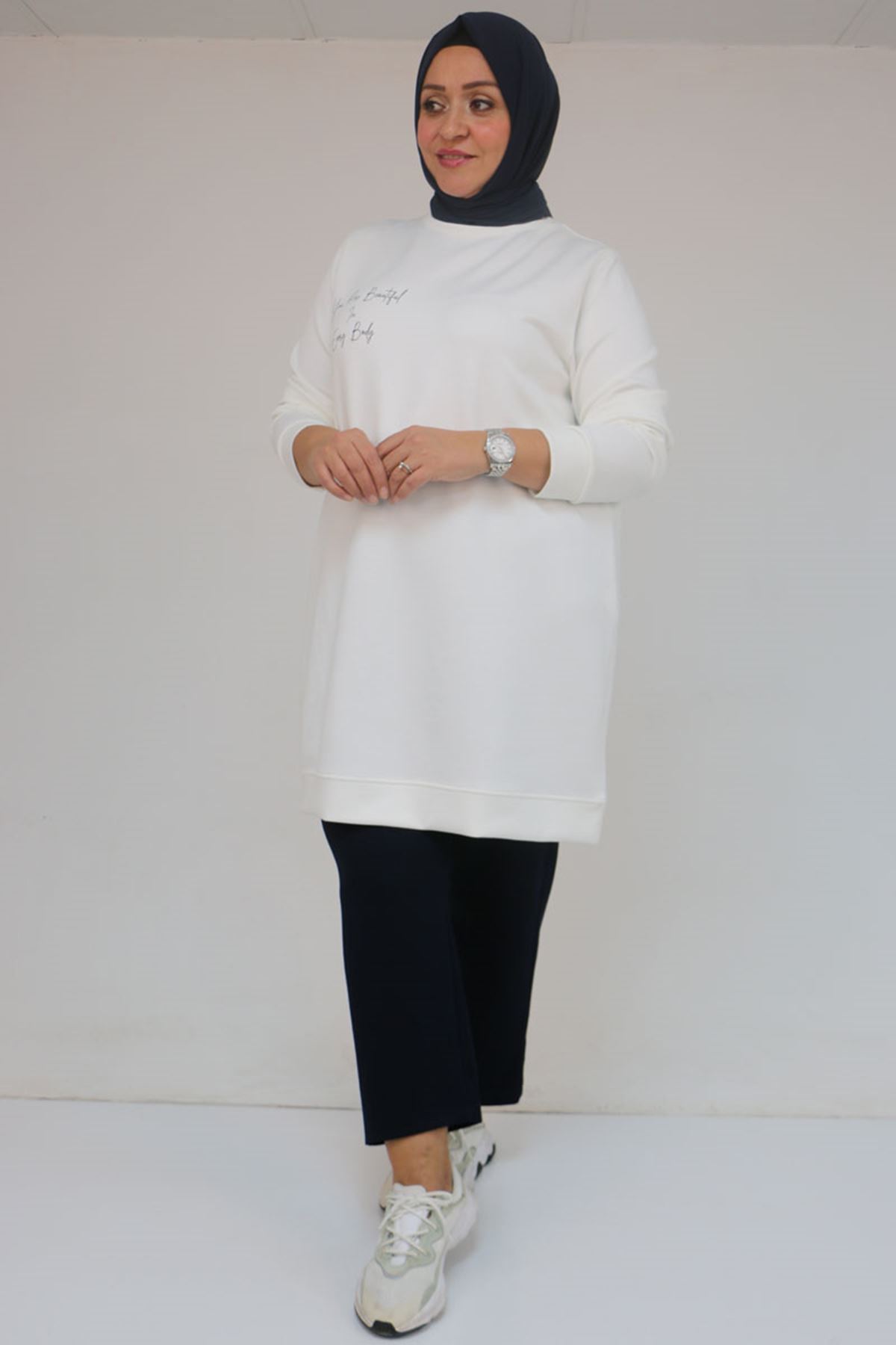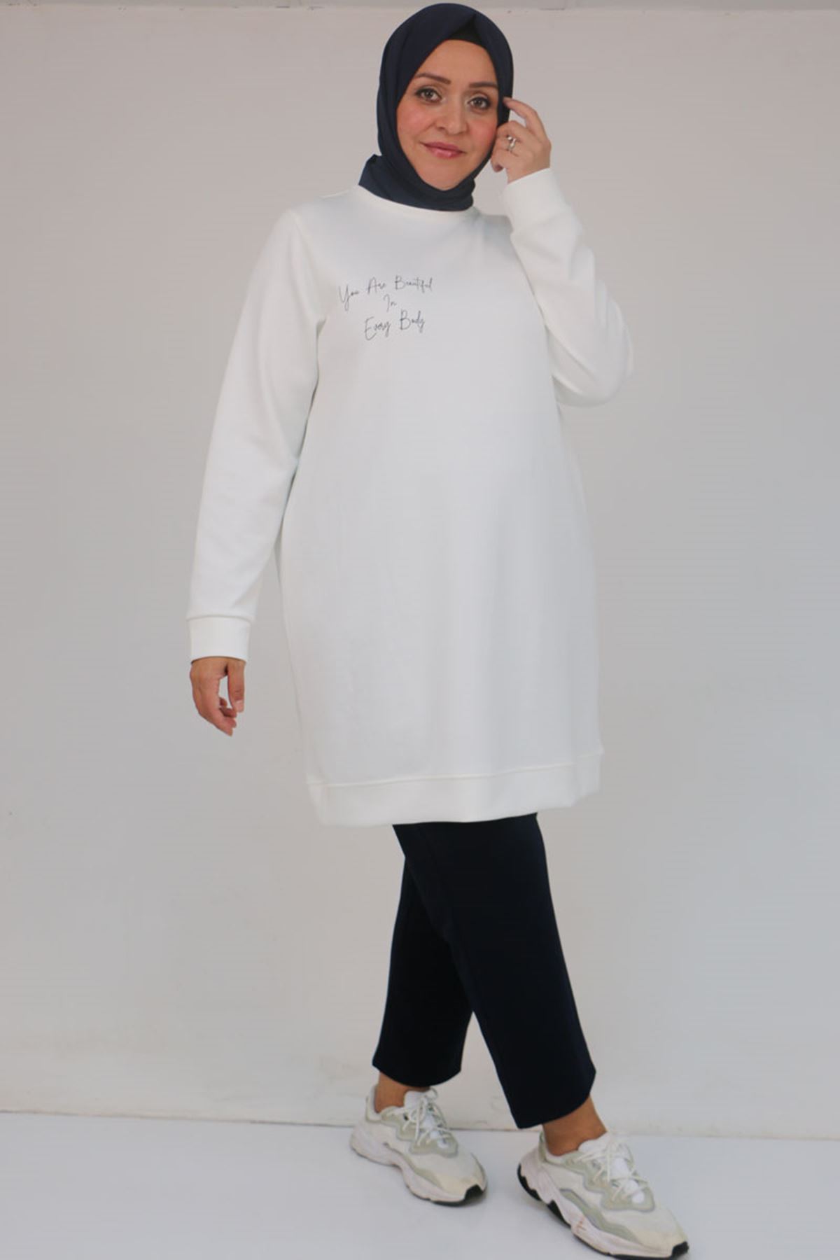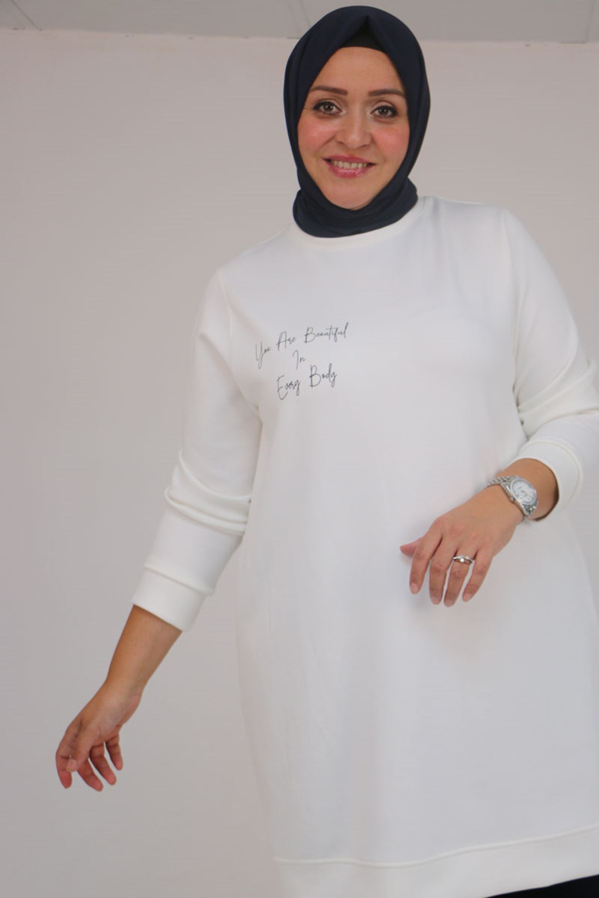 58128 Büyük Beden Baskı Detaylı Modal Tunik - Ekru