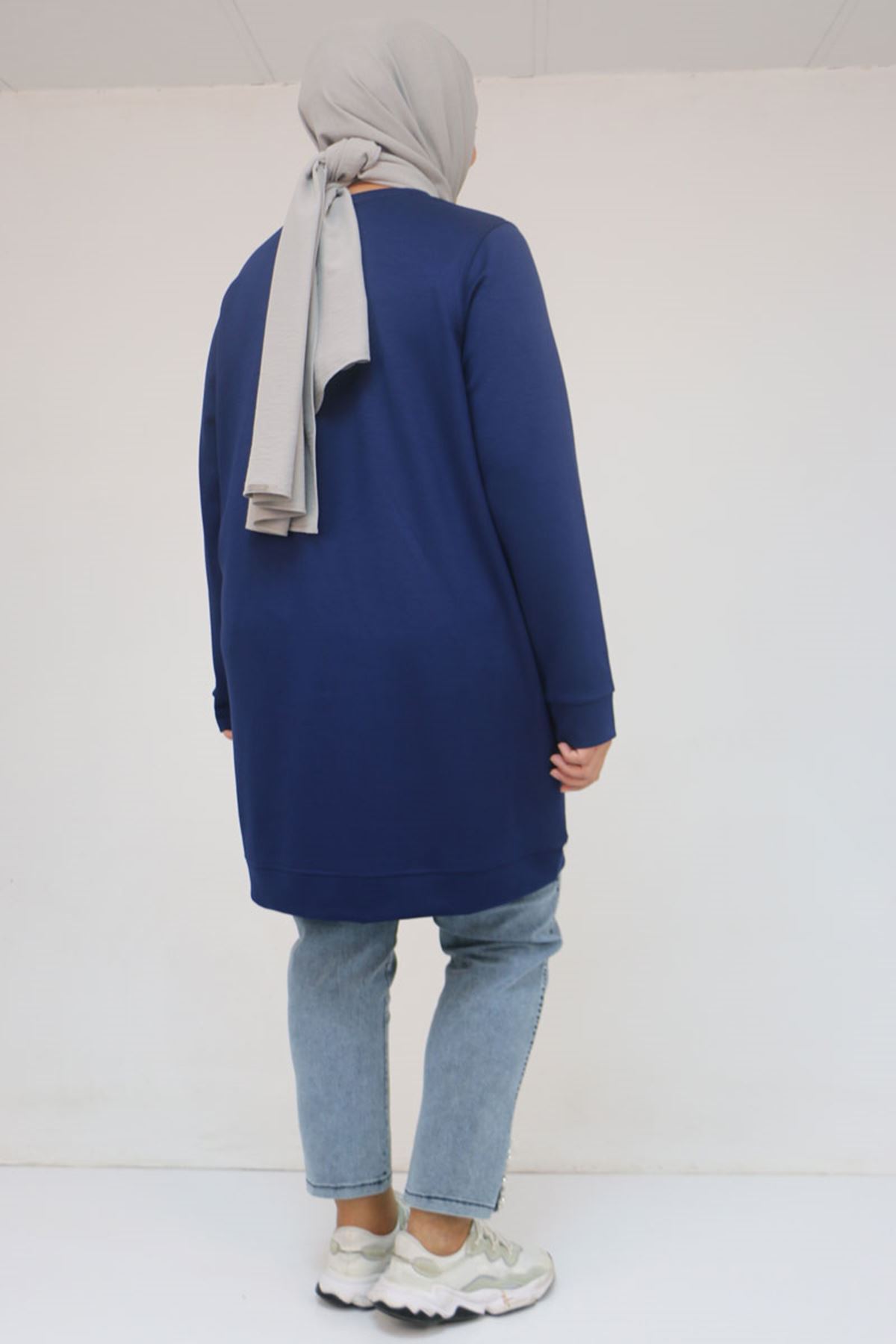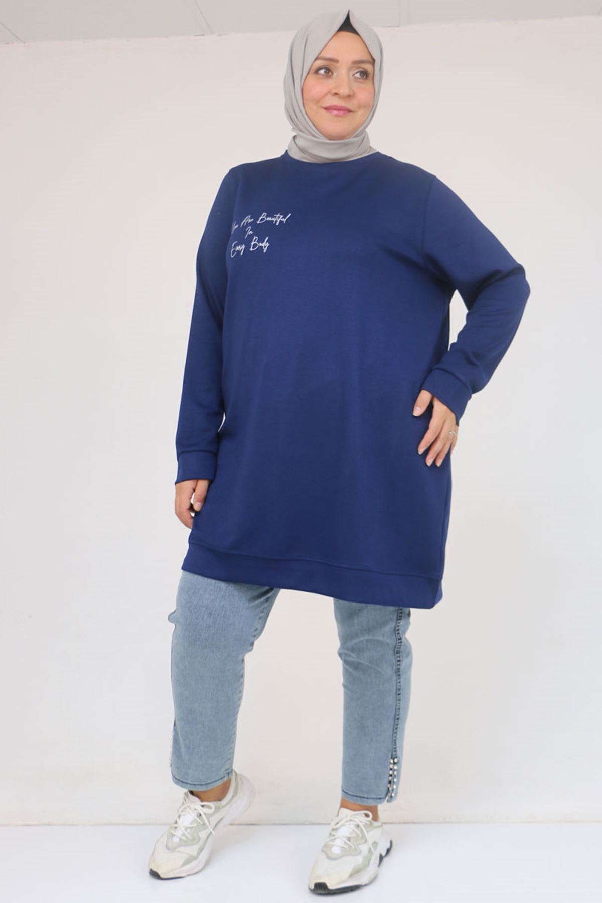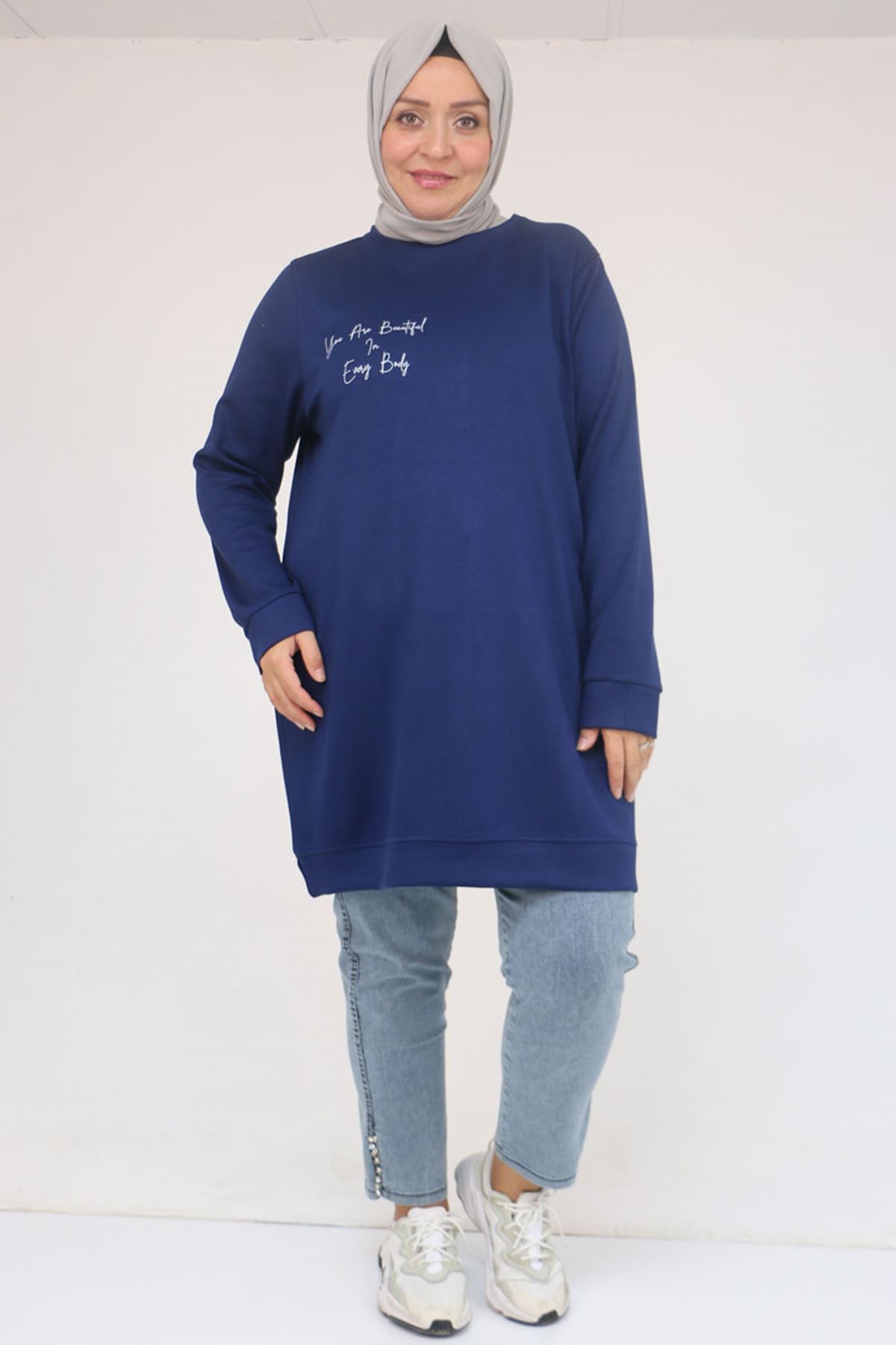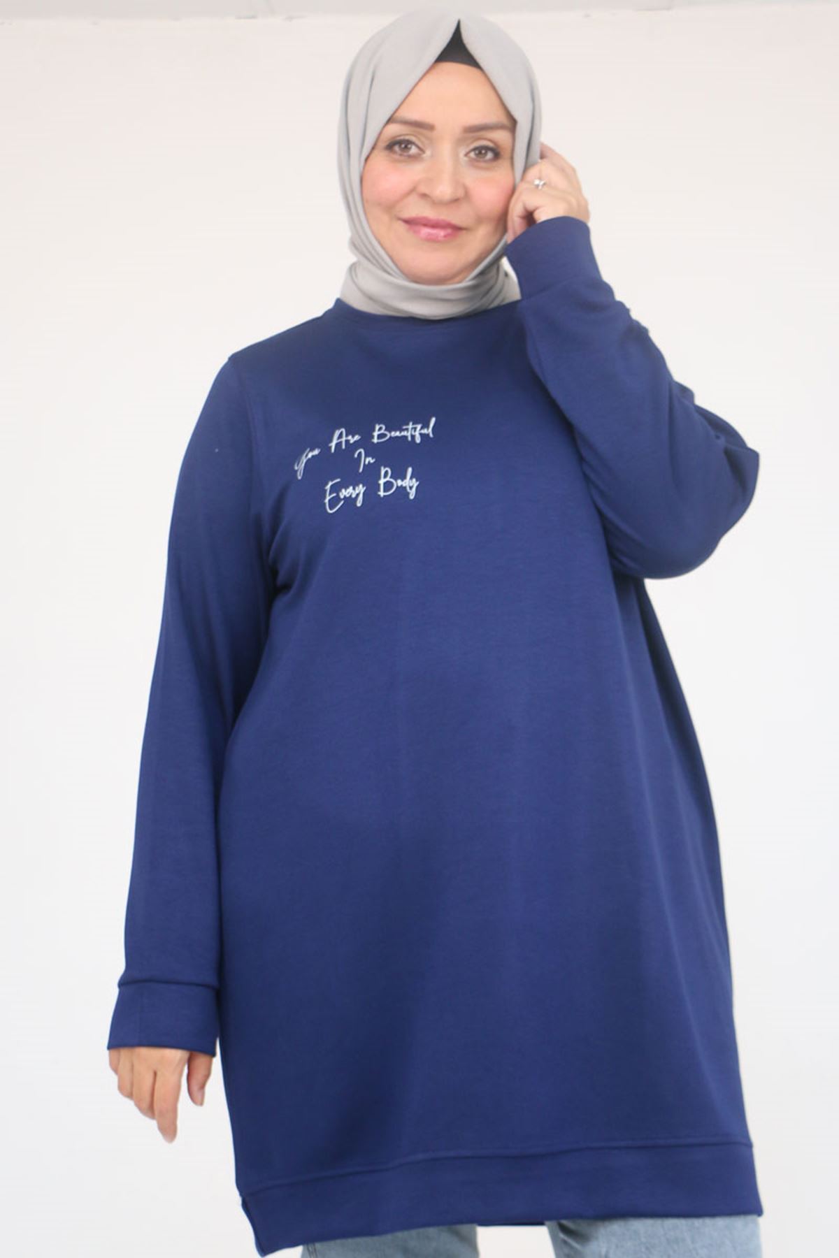 58128 Büyük Beden Baskı Detaylı Modal Tunik - İndigo