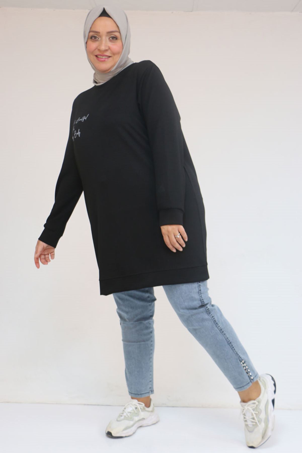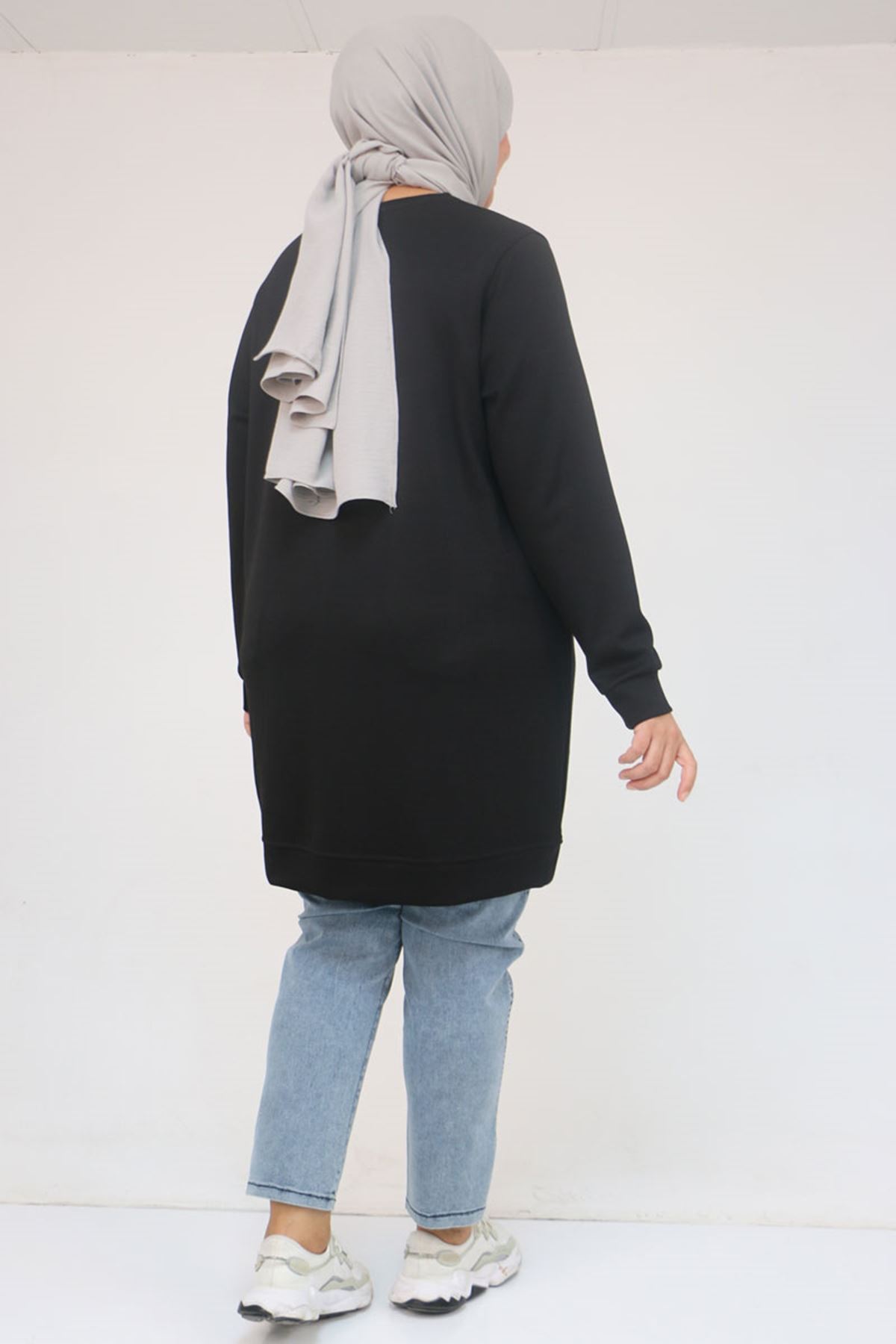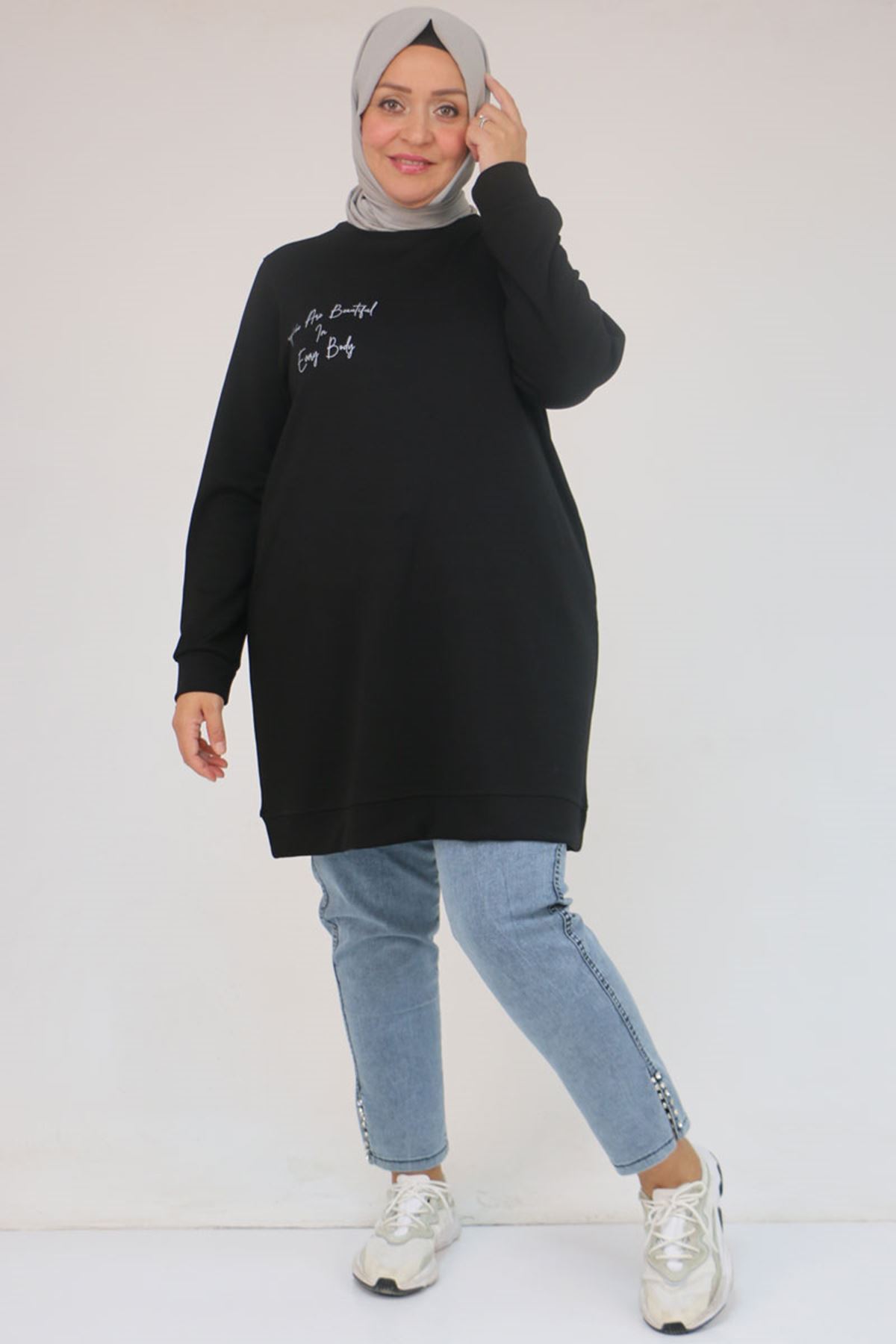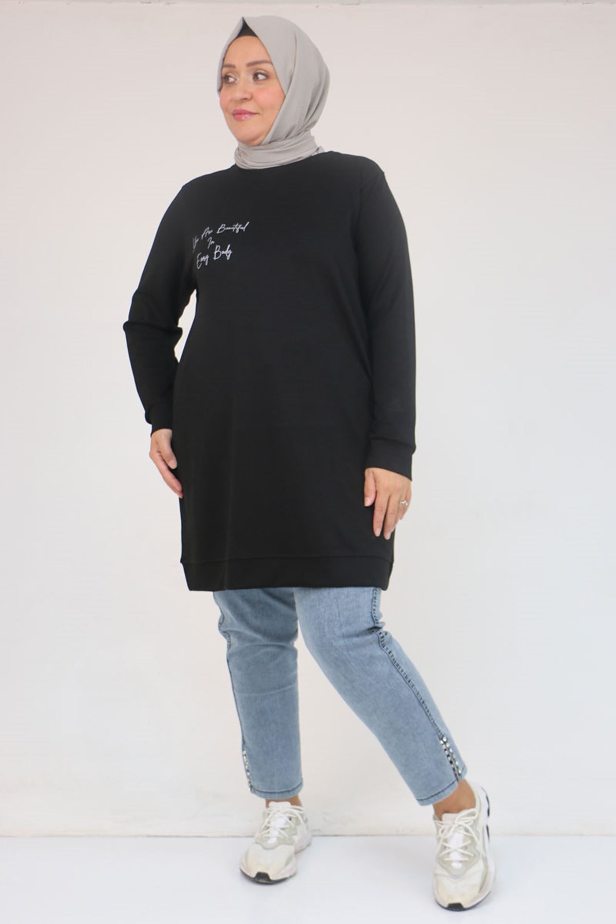 58128 Büyük Beden Baskı Detaylı Modal Tunik - Siyah