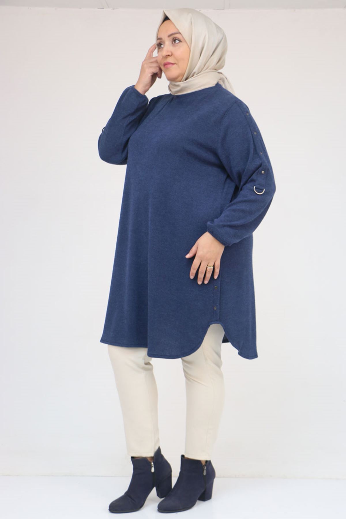 58131 Büyük Beden Kol Ve Etek Uçları Perçinli Mir Tunik - İndigo