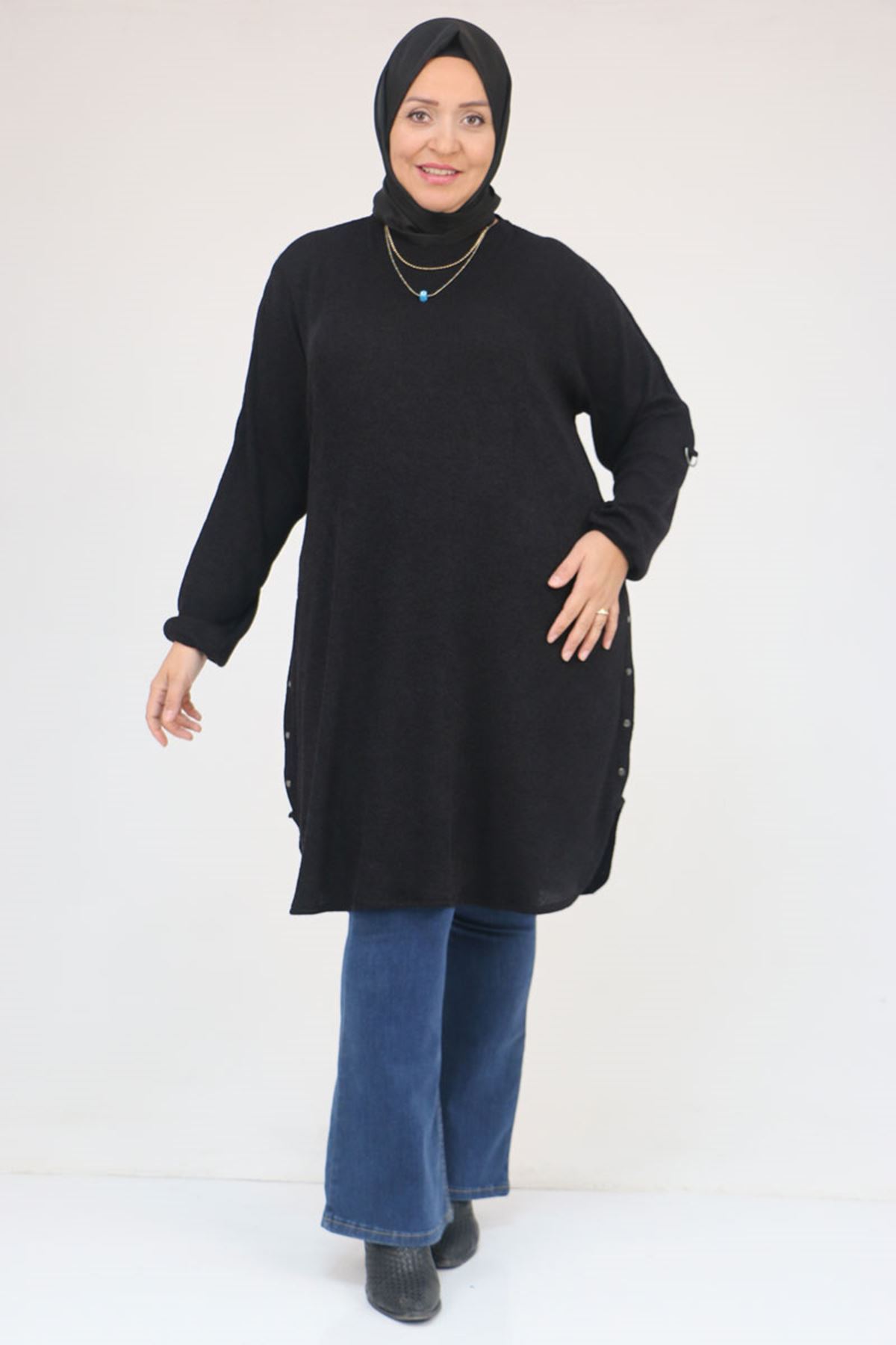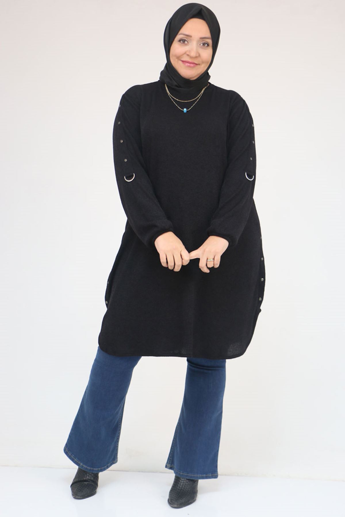 58131 Büyük Beden Kol Ve Etek Uçları Perçinli Mir Tunik - Siyah