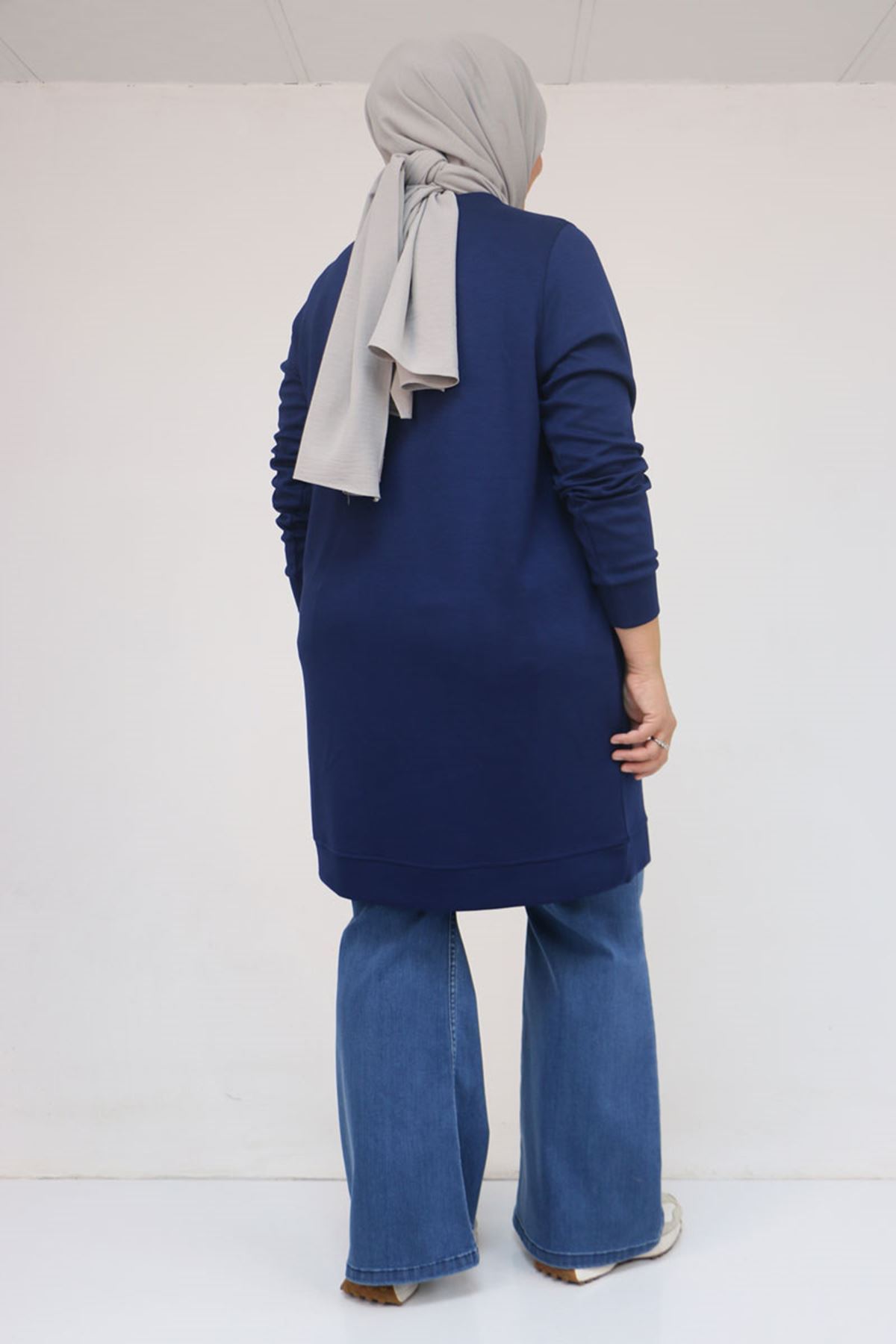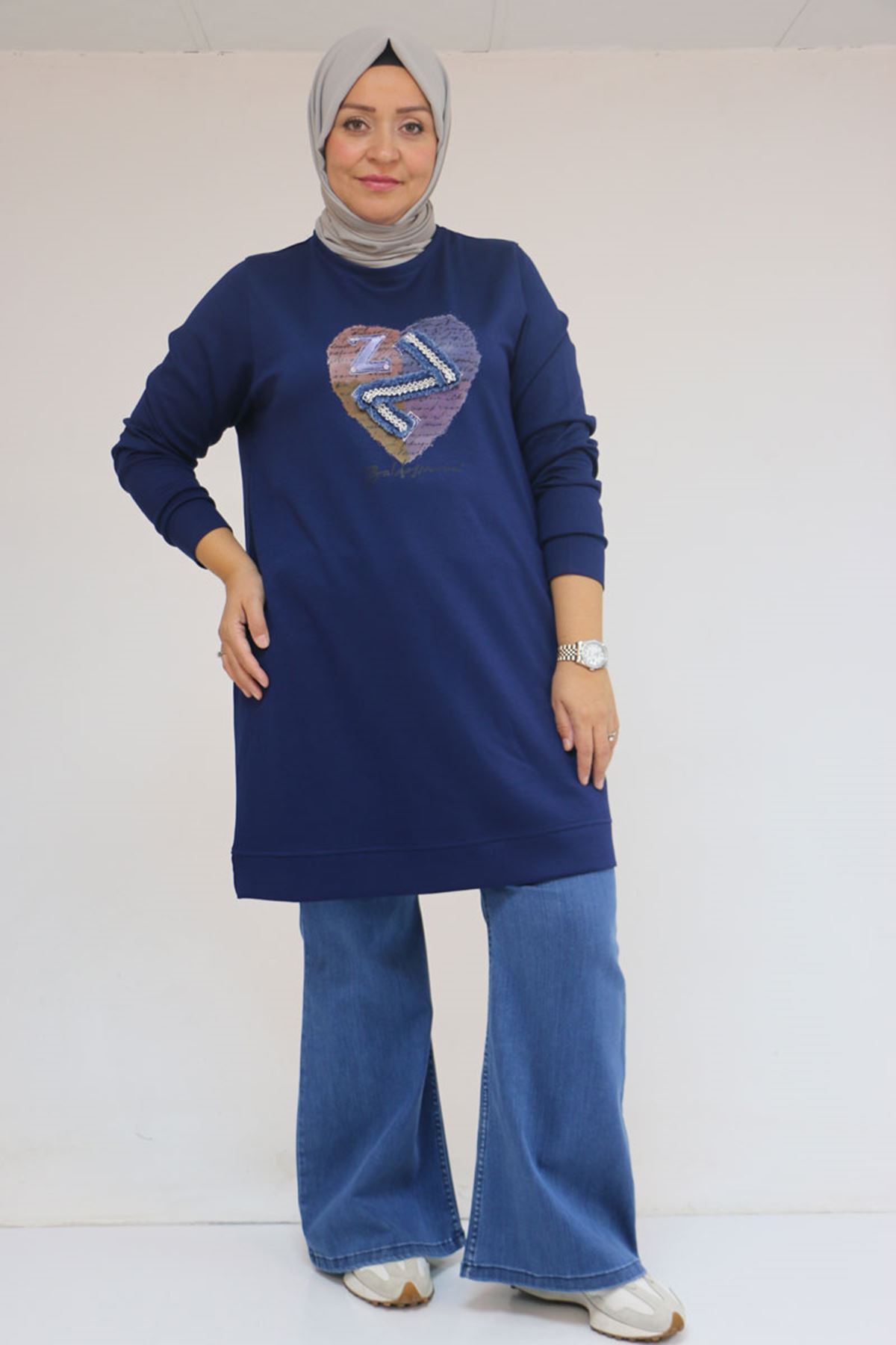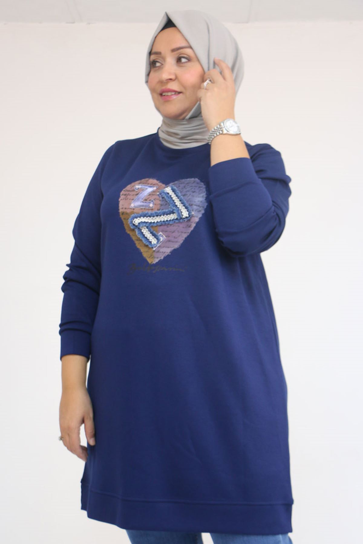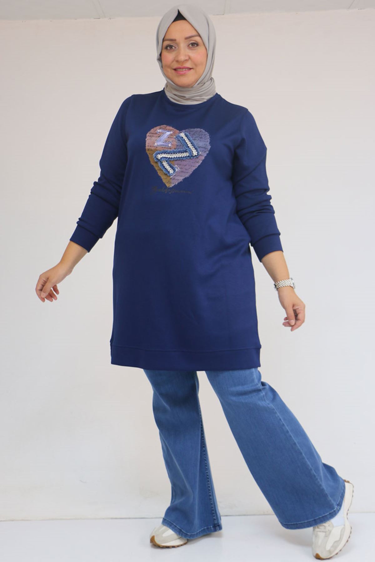 58141 Büyük Beden Önünde Kalp Baskılı Modal Tunik - İndigo