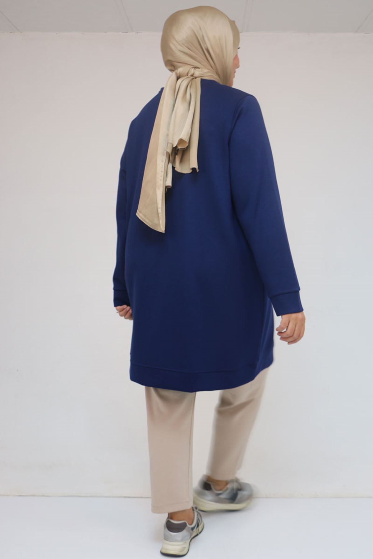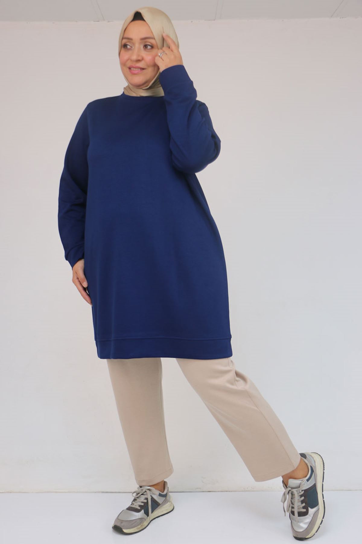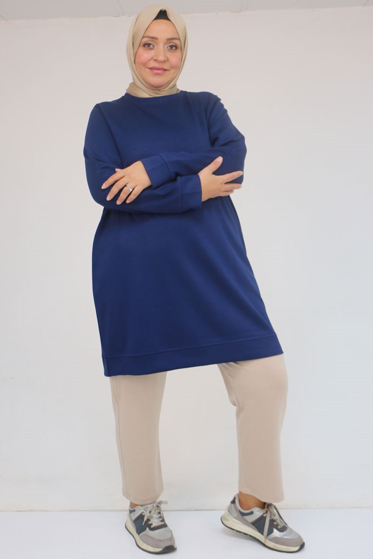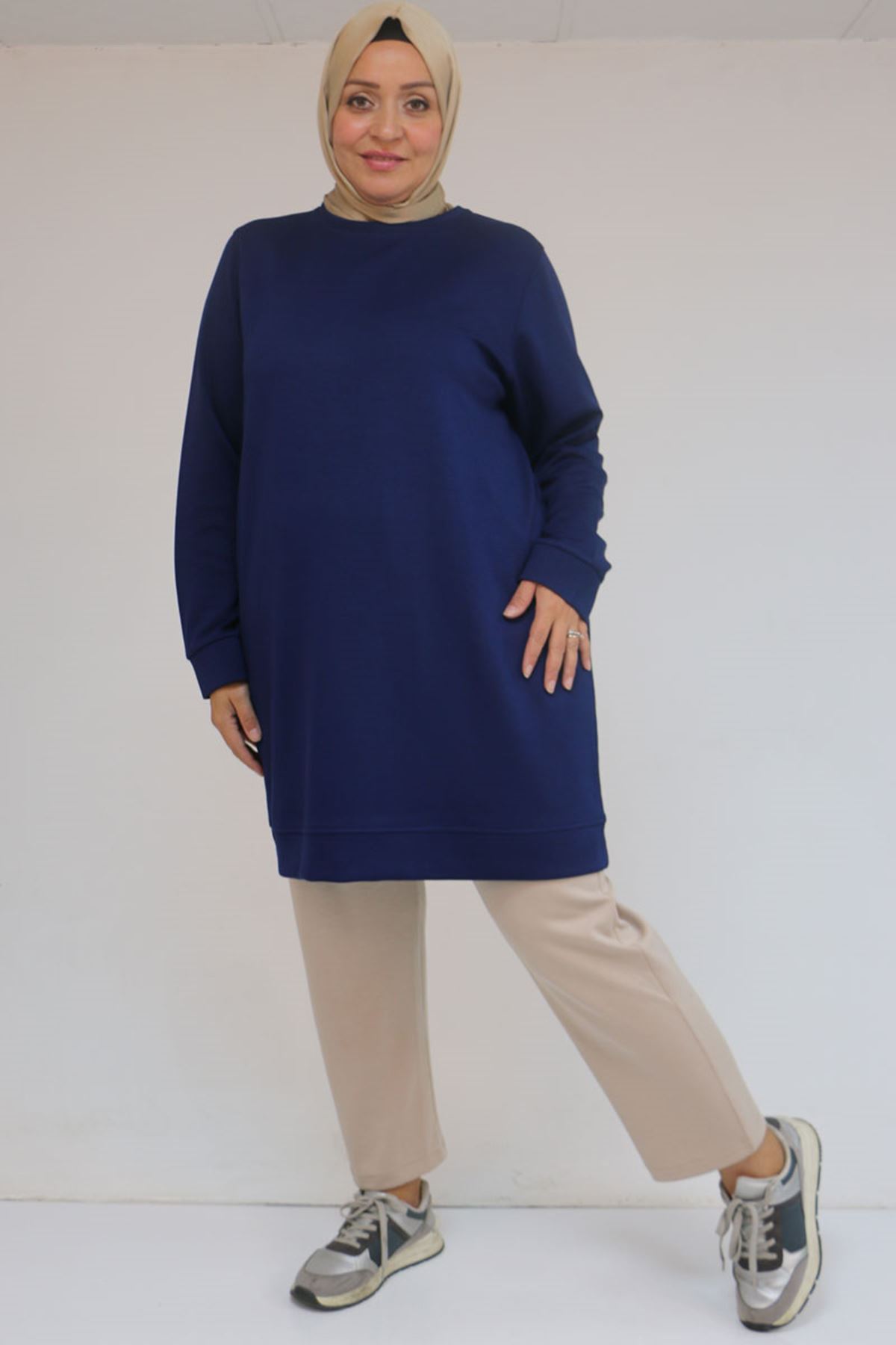 58142 Büyük Beden Kolları Manşetli Modal Tunik - İndigo