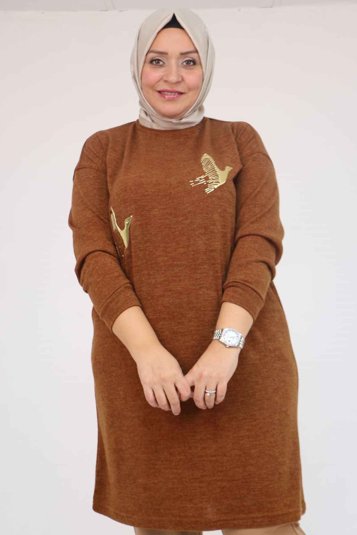 58143 Büyük Beden Düşük Kollu Aksesuar Detaylı Mir Tunik - Taba