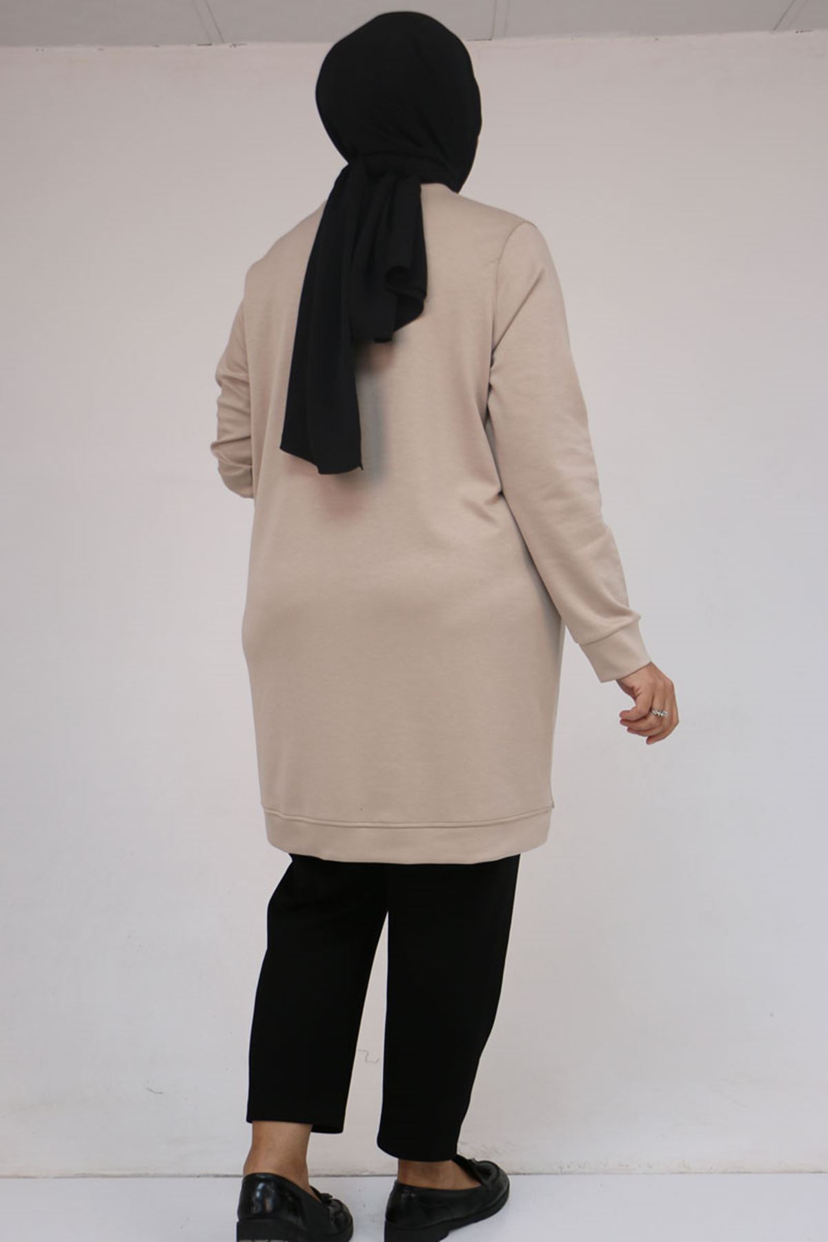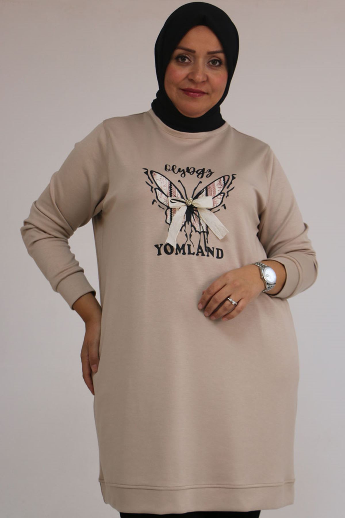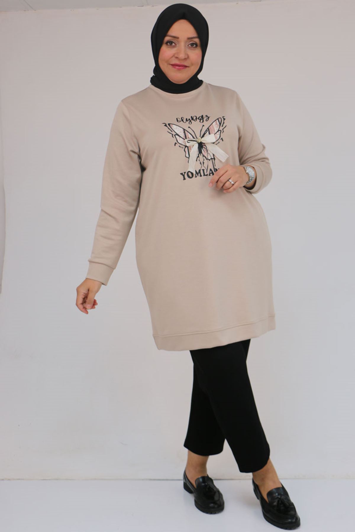 58145 Büyük Beden Kelebek Baskılı Modal Tunik - Vizon