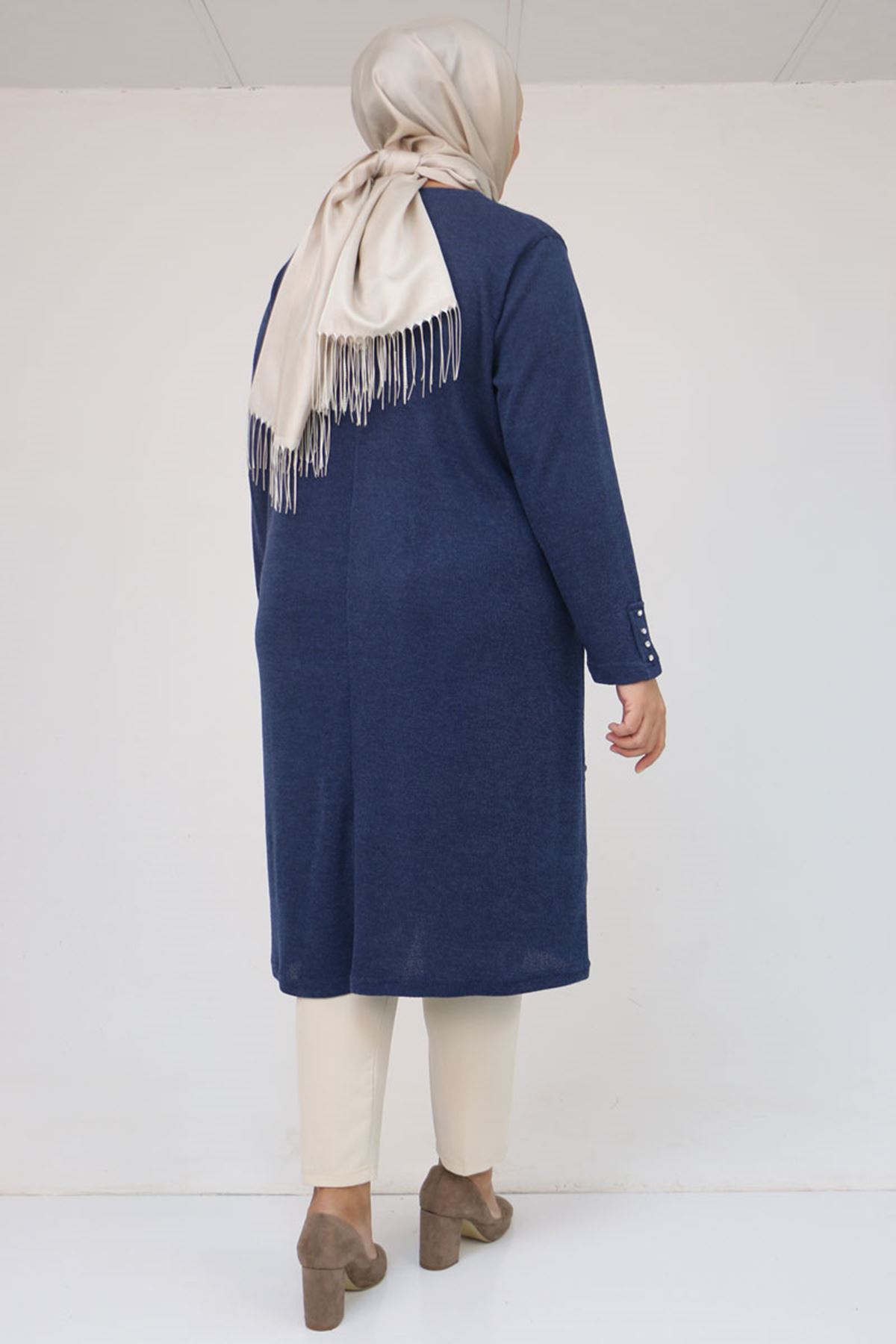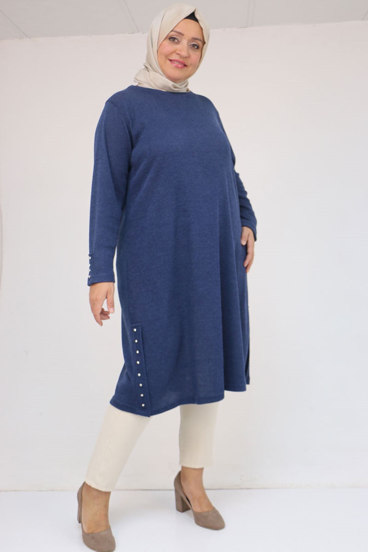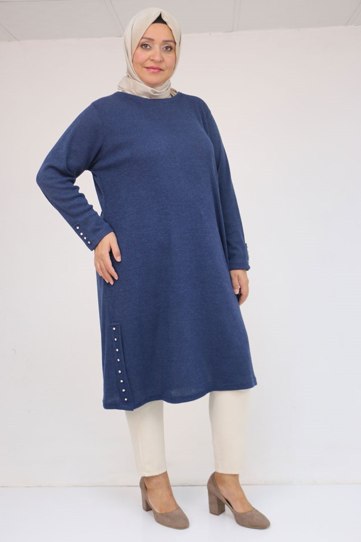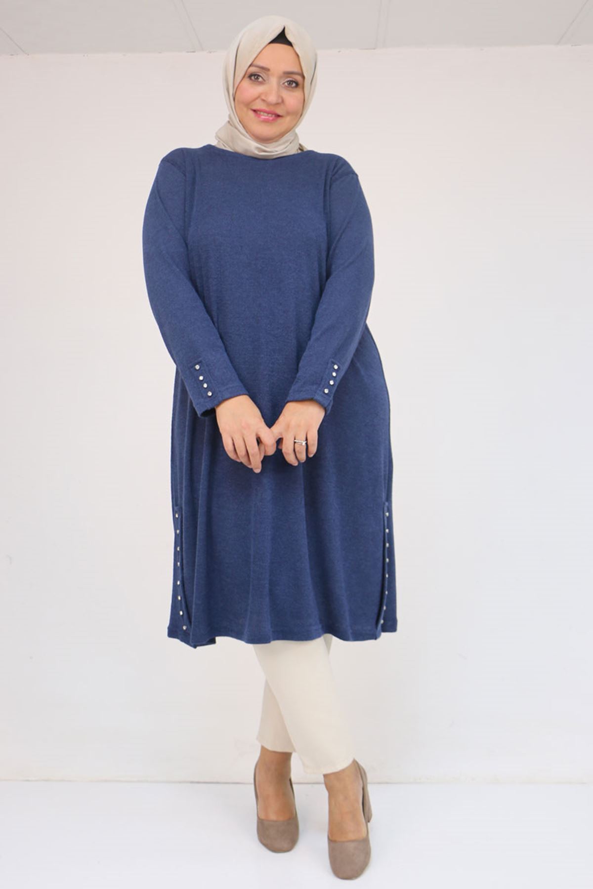 58146 Büyük Beden Kol Ve Yan Patları Taş Detaylı Mir Tunik - İndigo