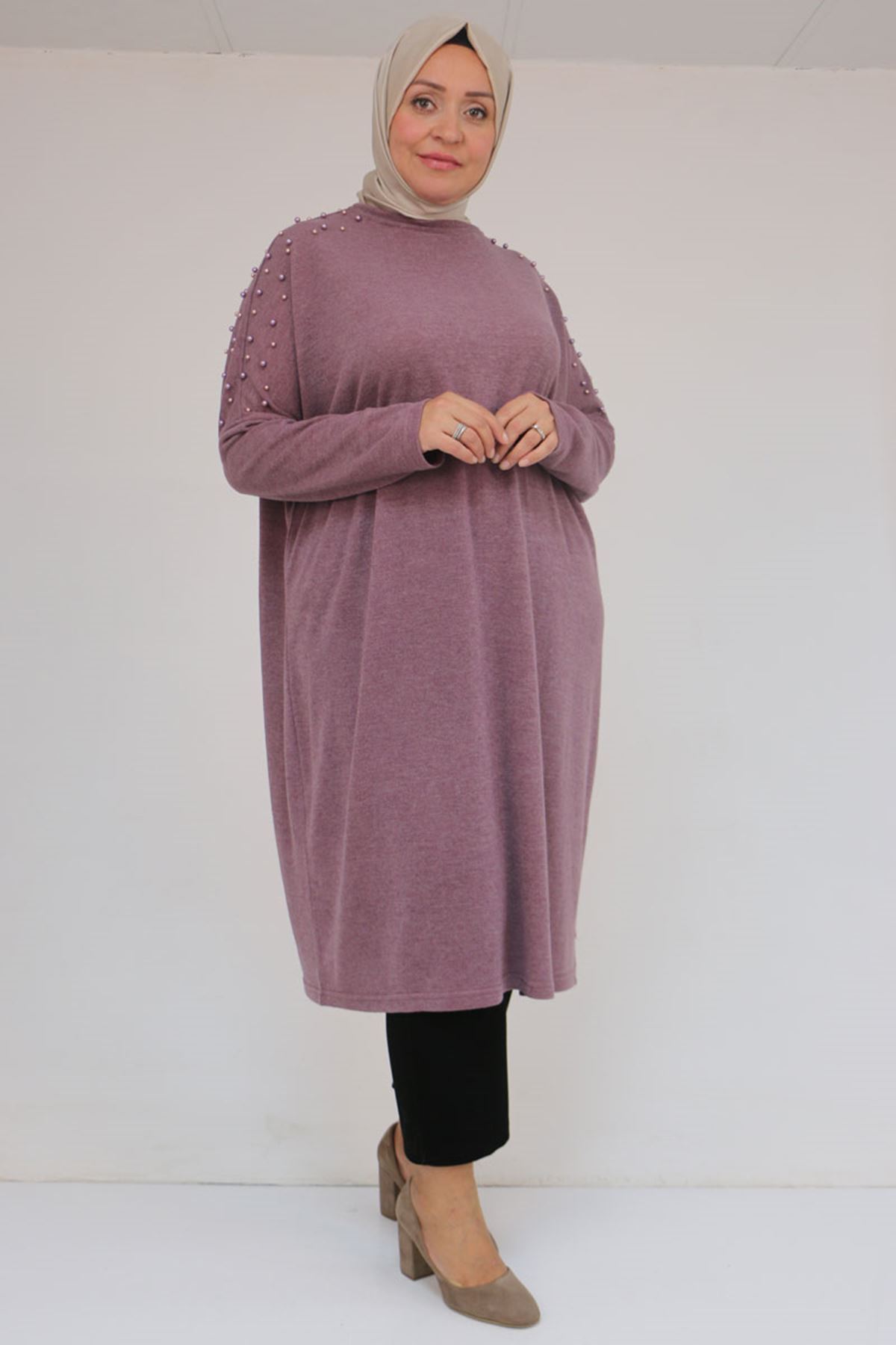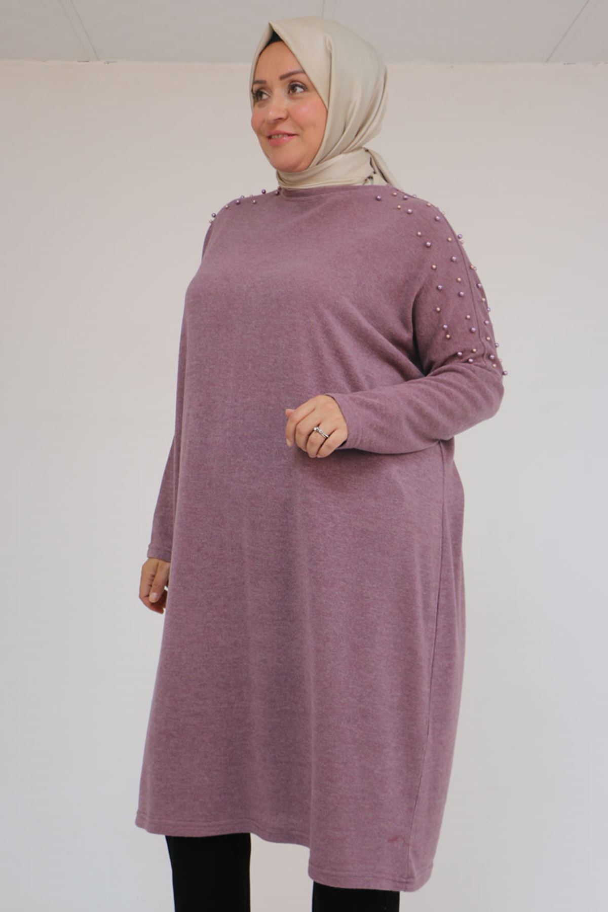 58152 Büyük Beden Düşükkol Omzu Taş Detaylı Mir Tunik - Gül Kurusu