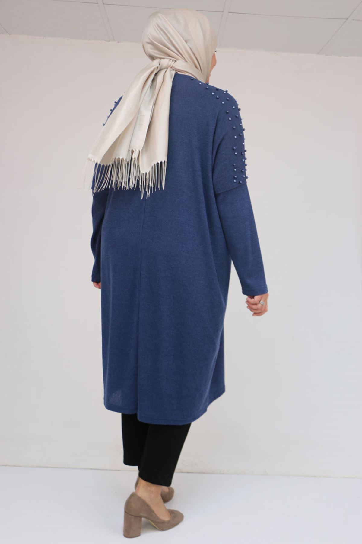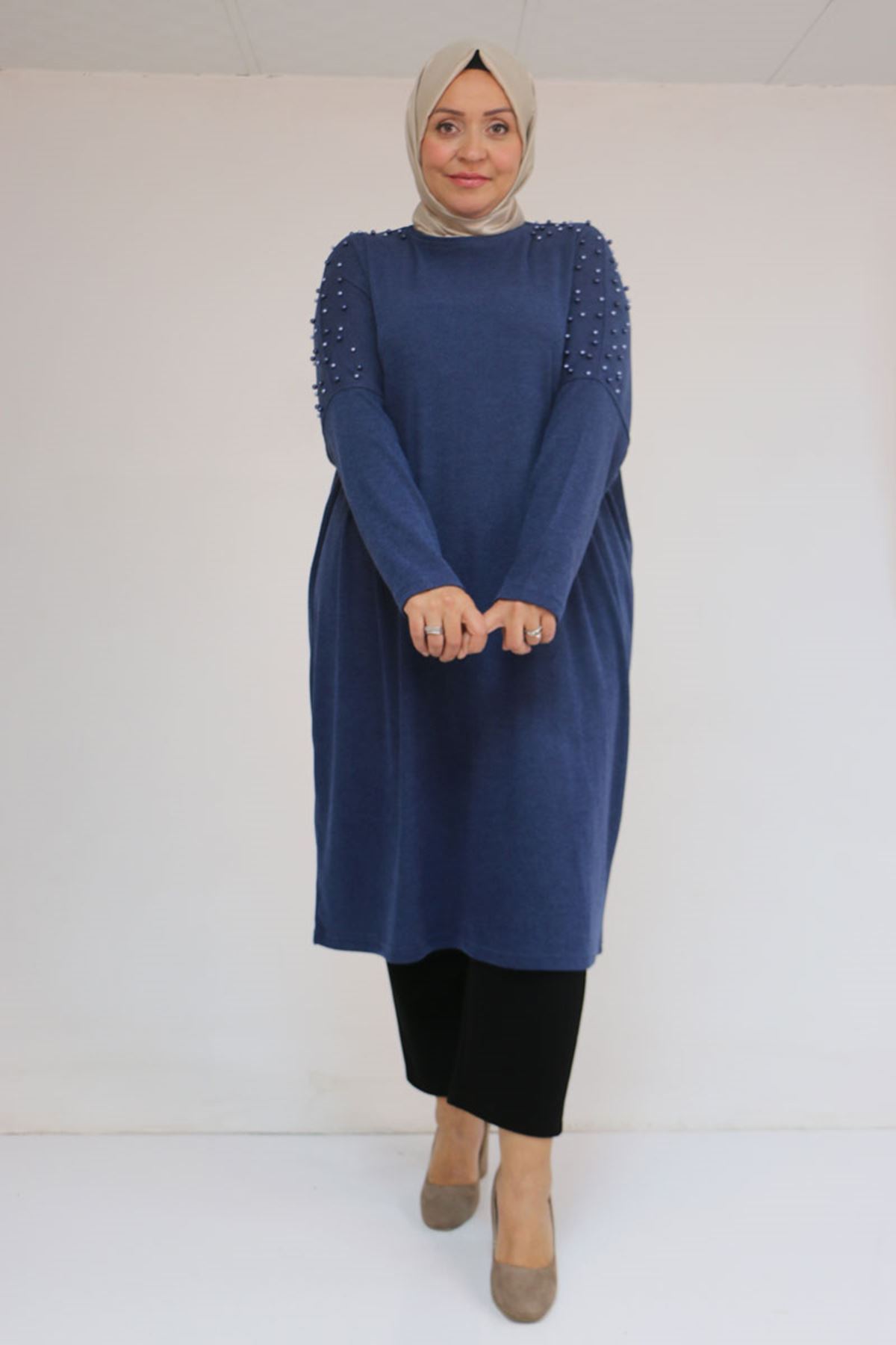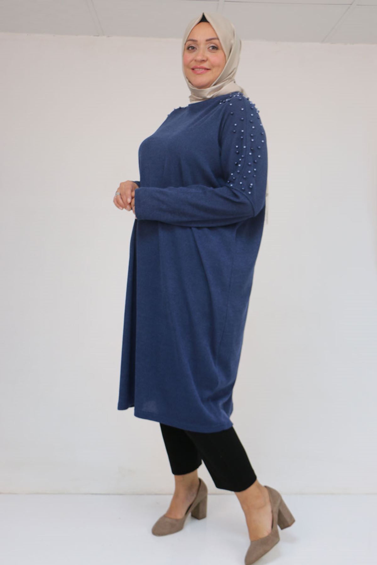 58152 Büyük Beden Düşükkol Omzu Taş Detaylı Mir Tunik - İndigo