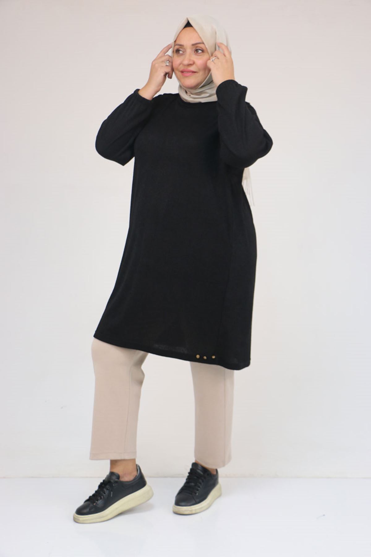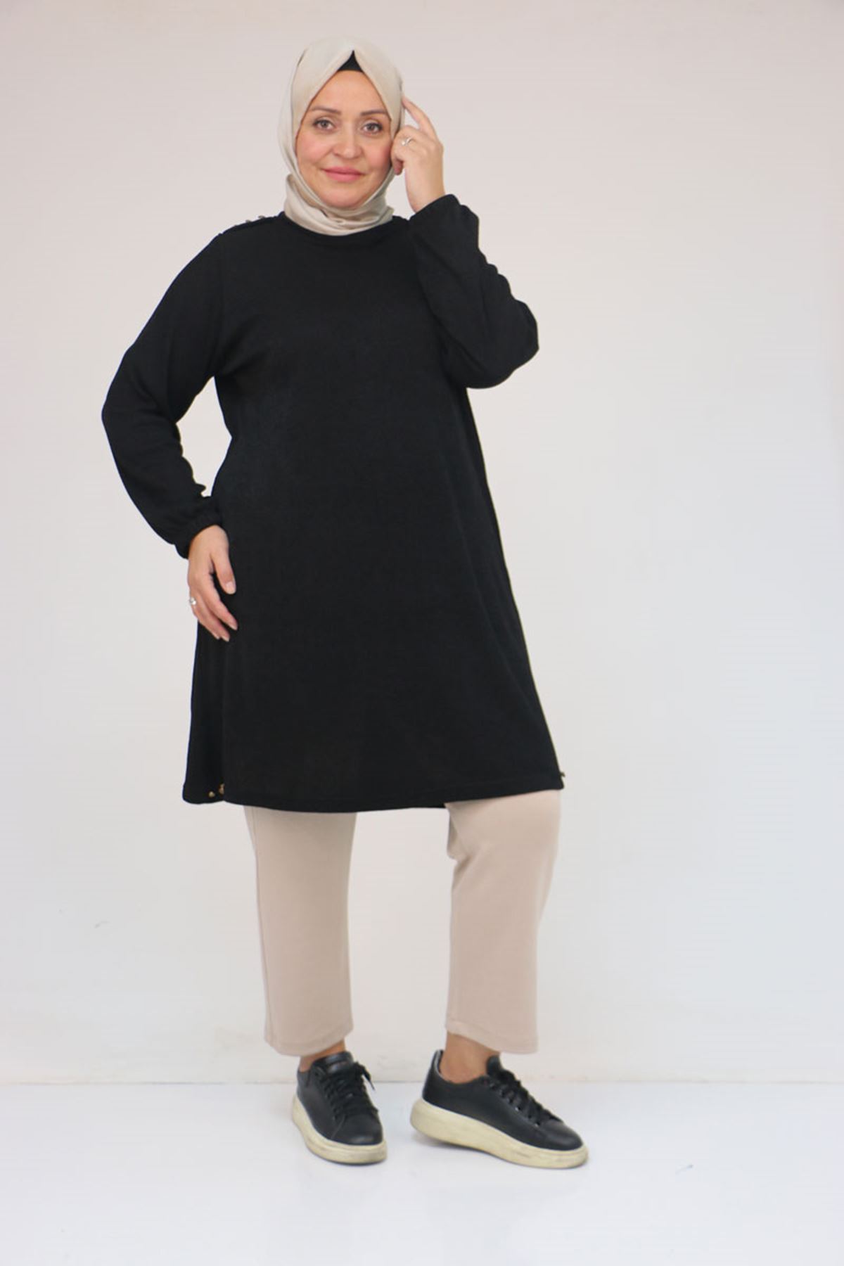 58155 Büyük Beden Kolları Lastikli Perçinli Mir Tunik - Siyah