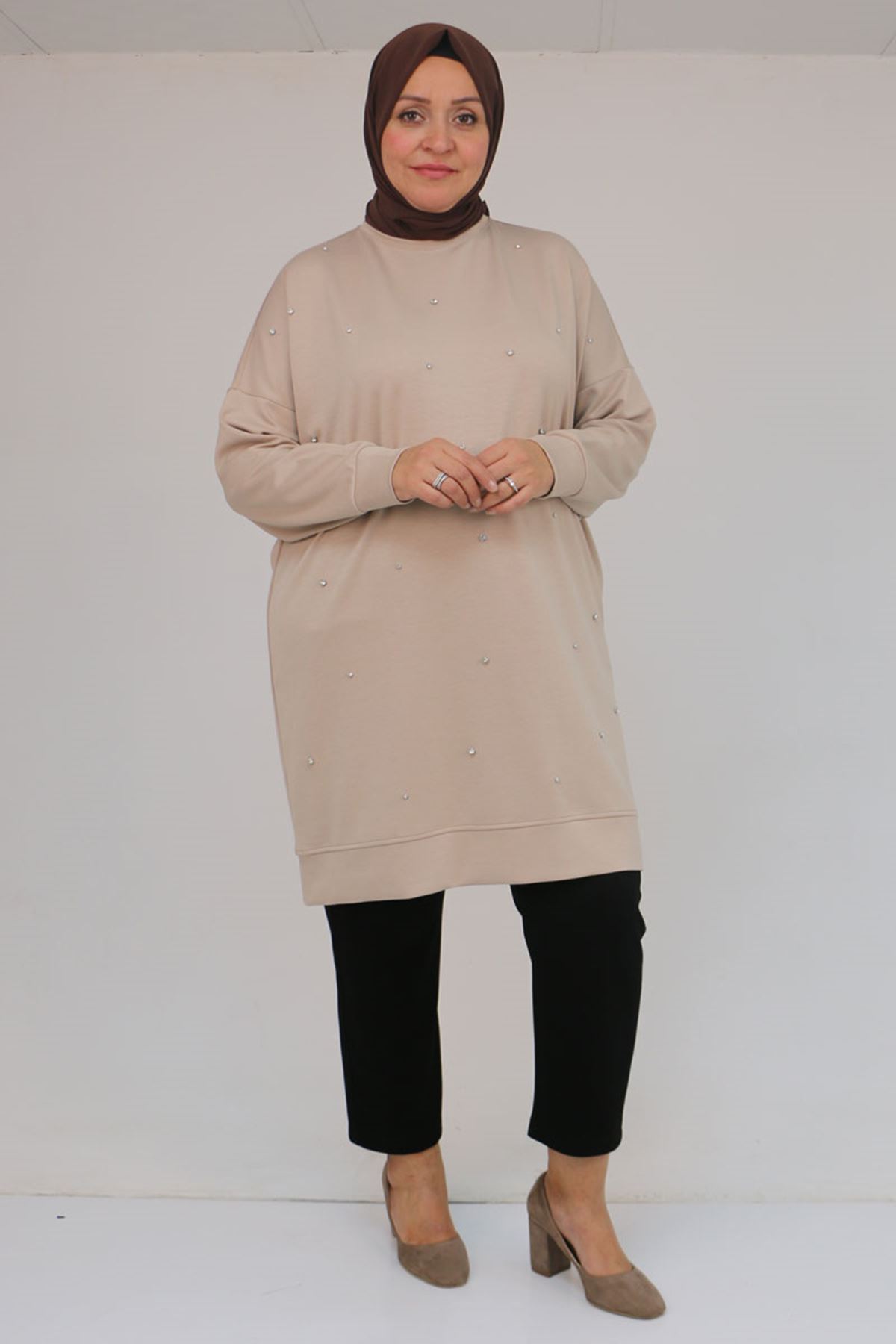 58157 Büyük Beden Beyoğlu Taş Çakmalı Modal Tunik - Vizon