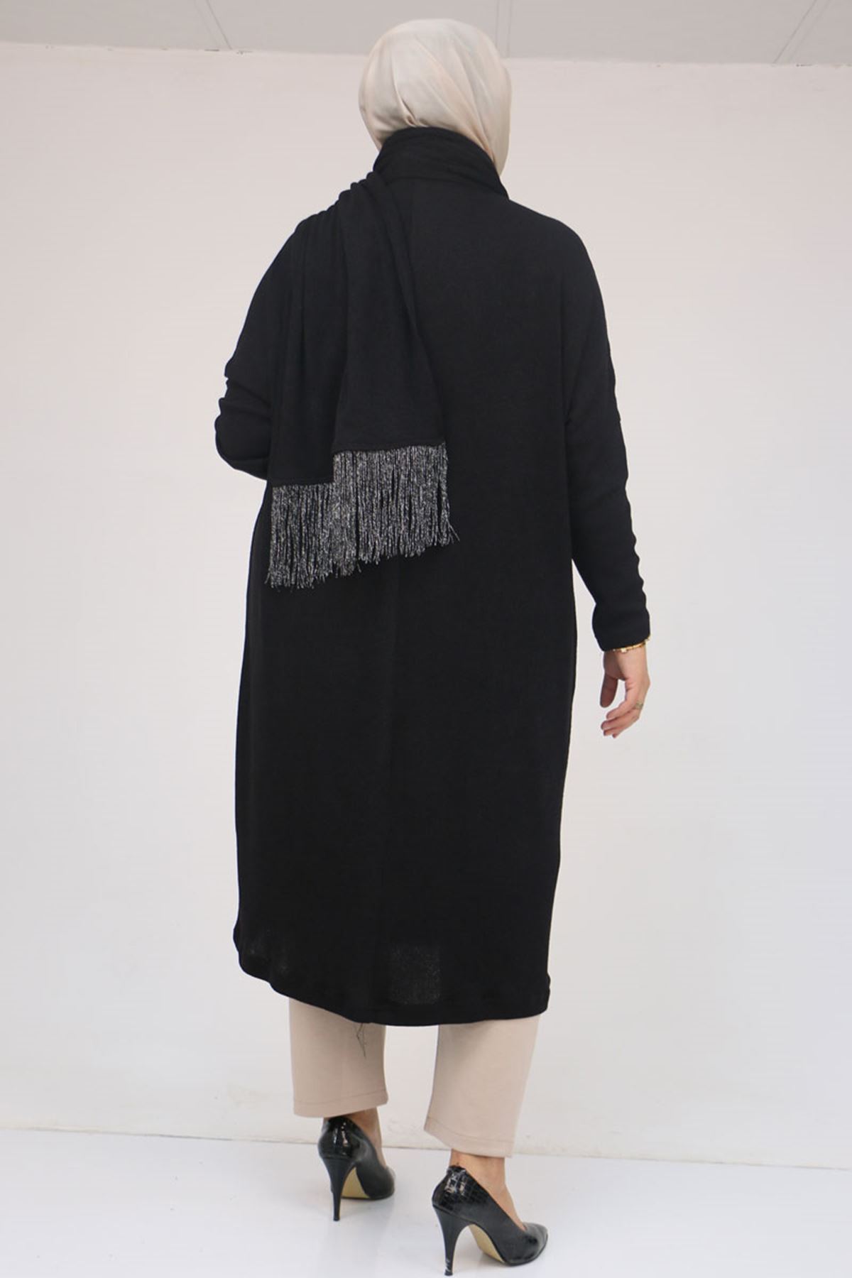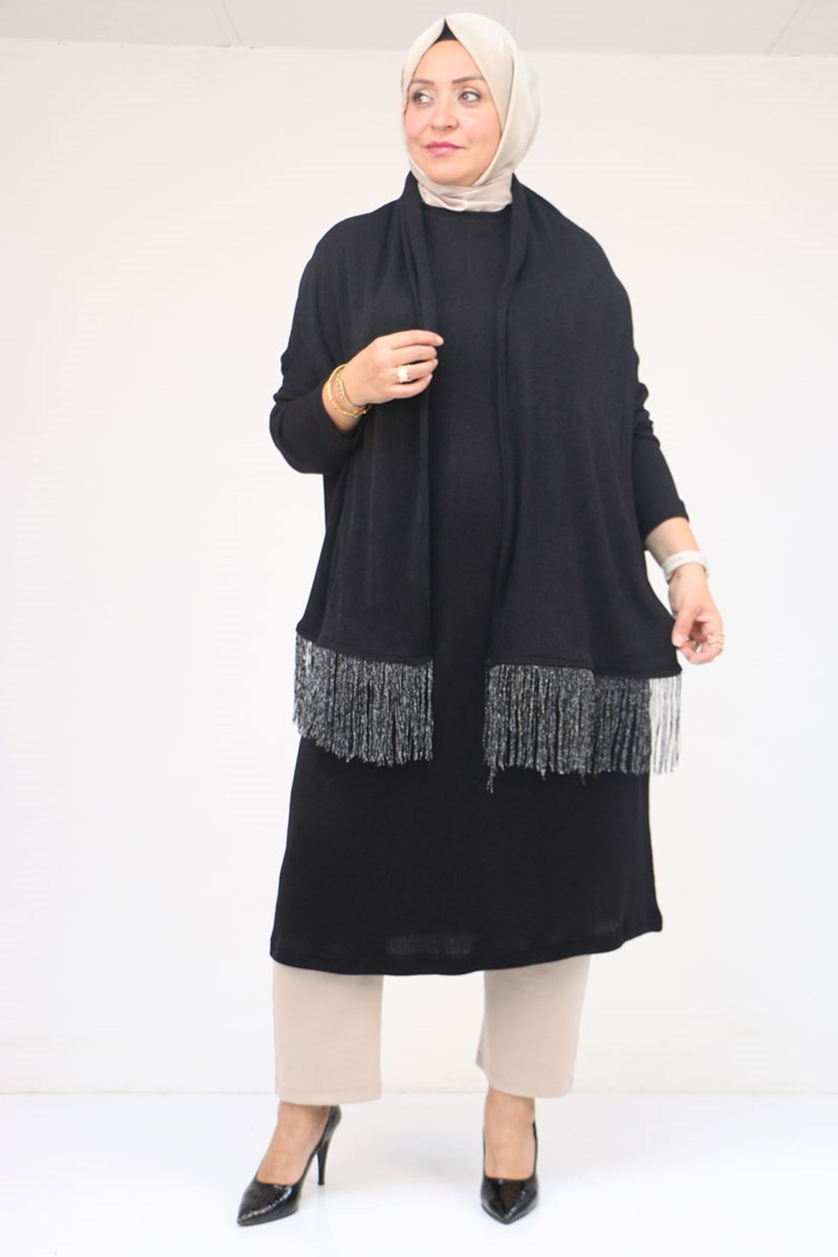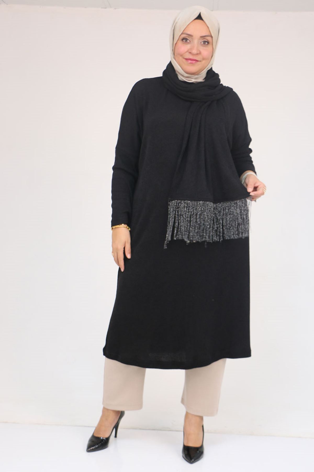 58158-1 Büyük Beden Atkısı Püsküllü Mir Tunik - Siyah