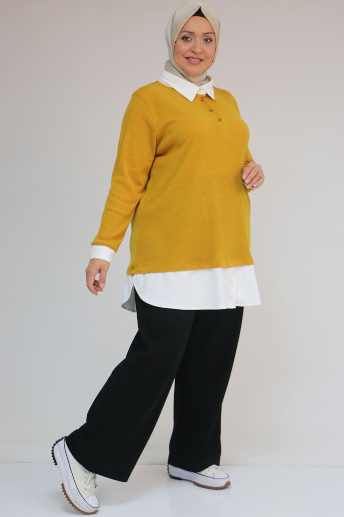 58159 Büyük Beden Gömlek Yaka Görünümlü Garnili Mir Tunik - Hardal
