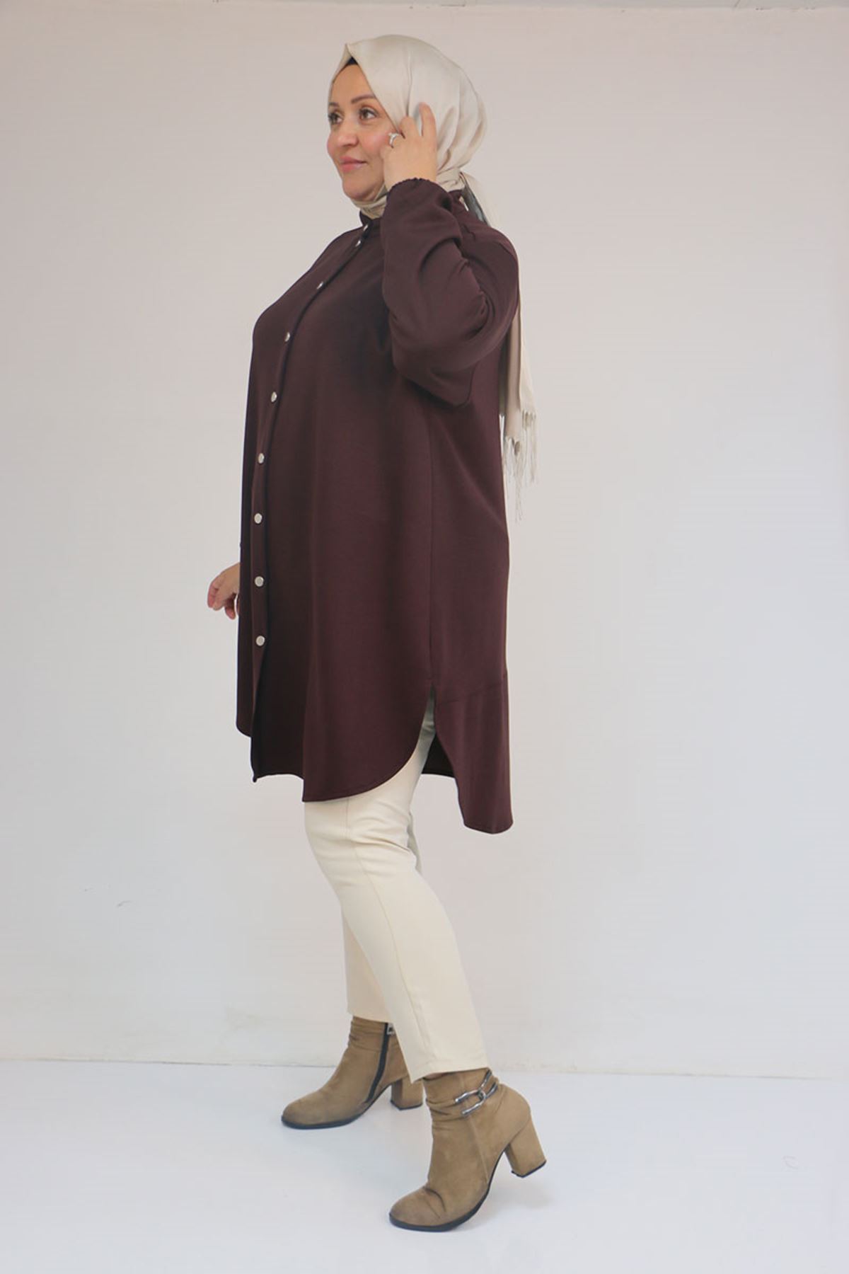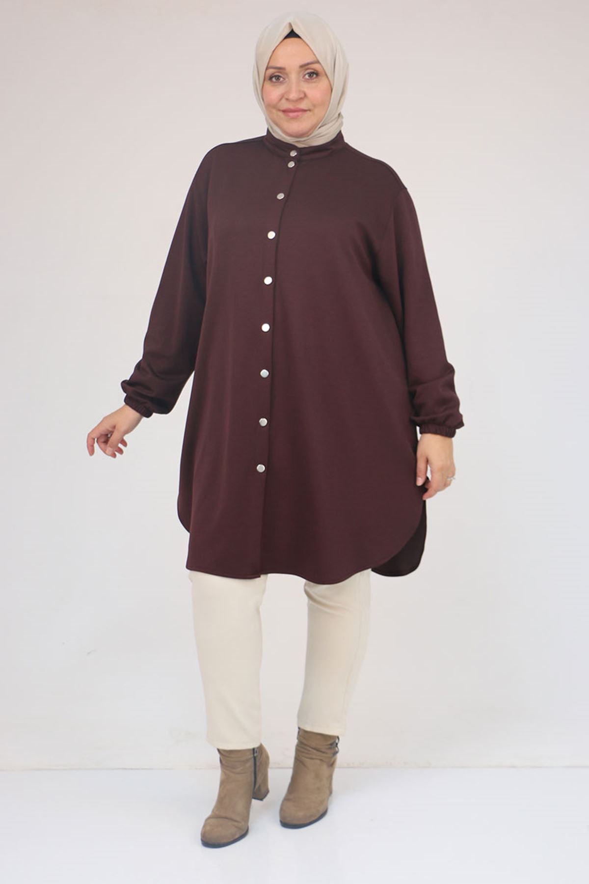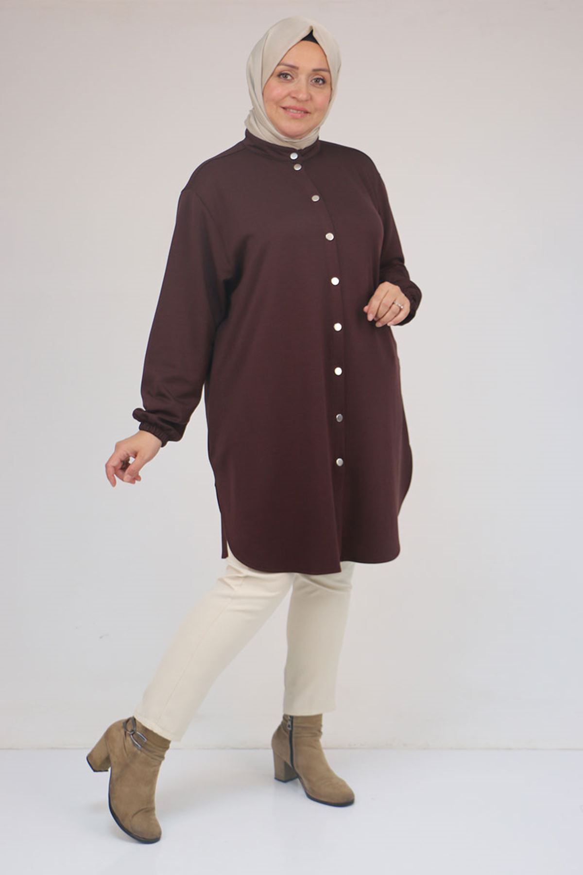 58169 Büyük Beden Hakim Yaka Çıtçıtlı Modal Tunik - Kahve
