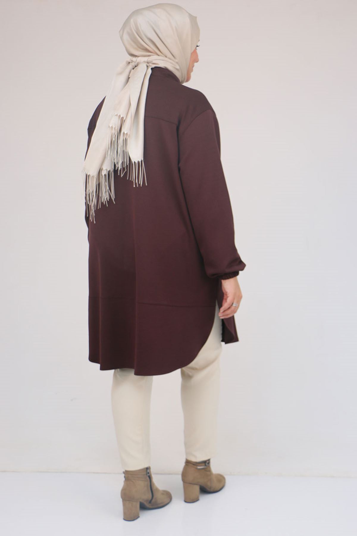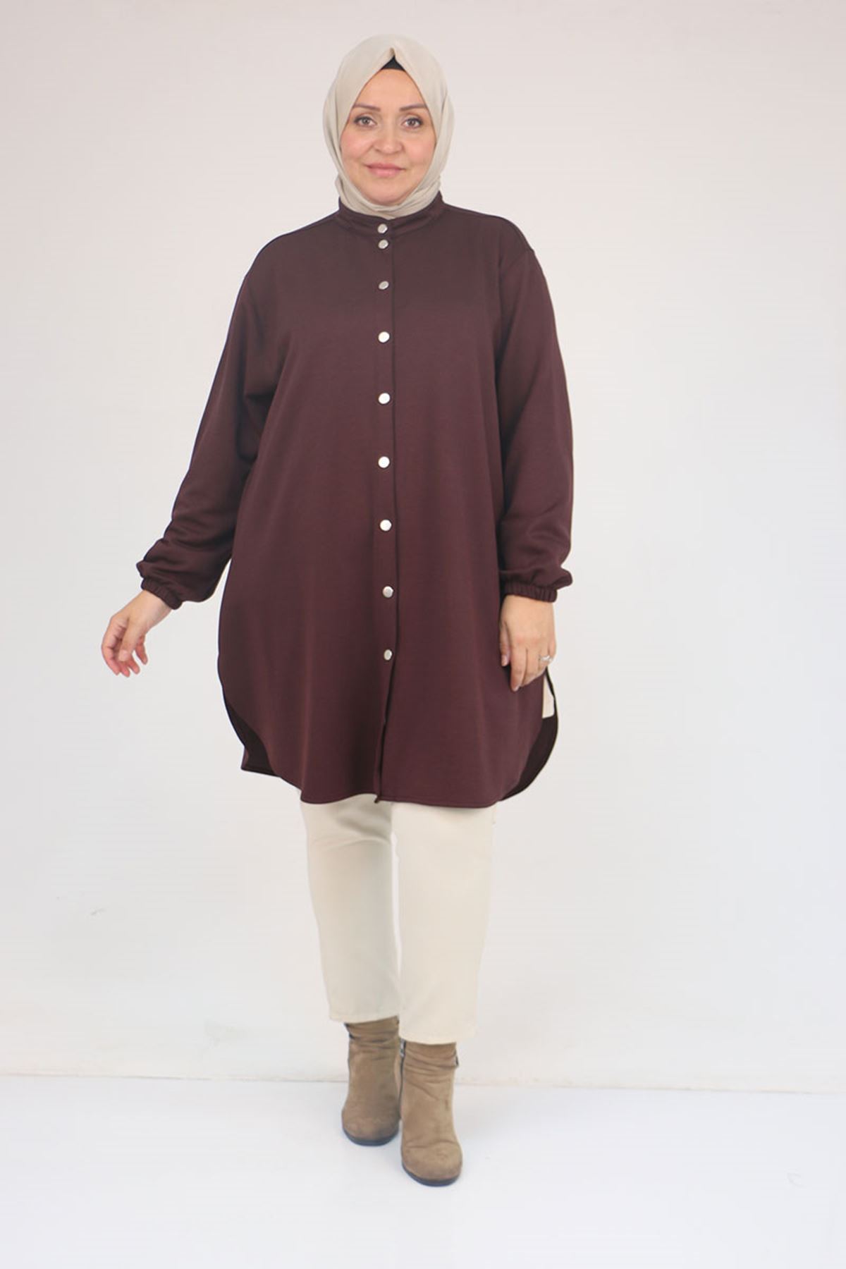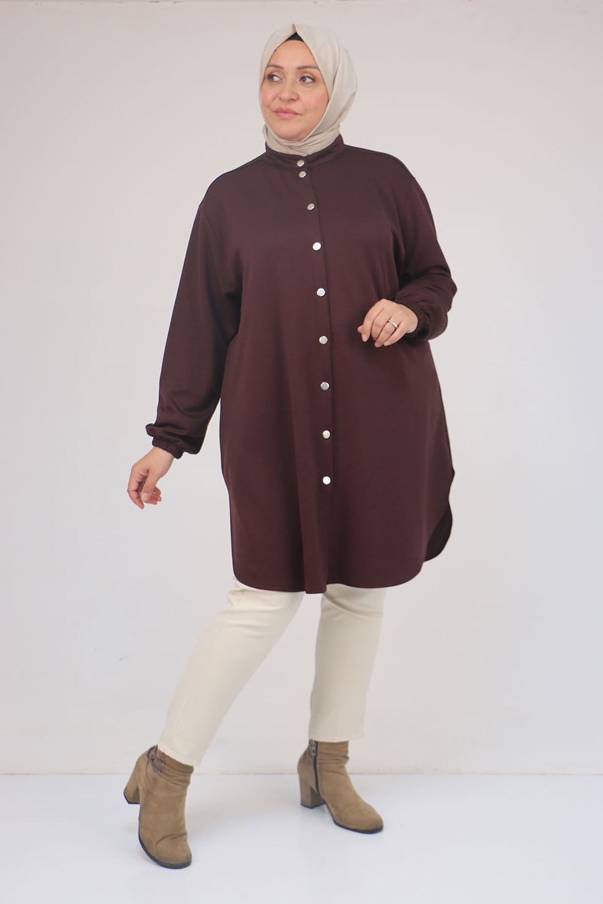 58169 Büyük Beden Hakim Yaka Çıtçıtlı Modal Tunik - Kahve