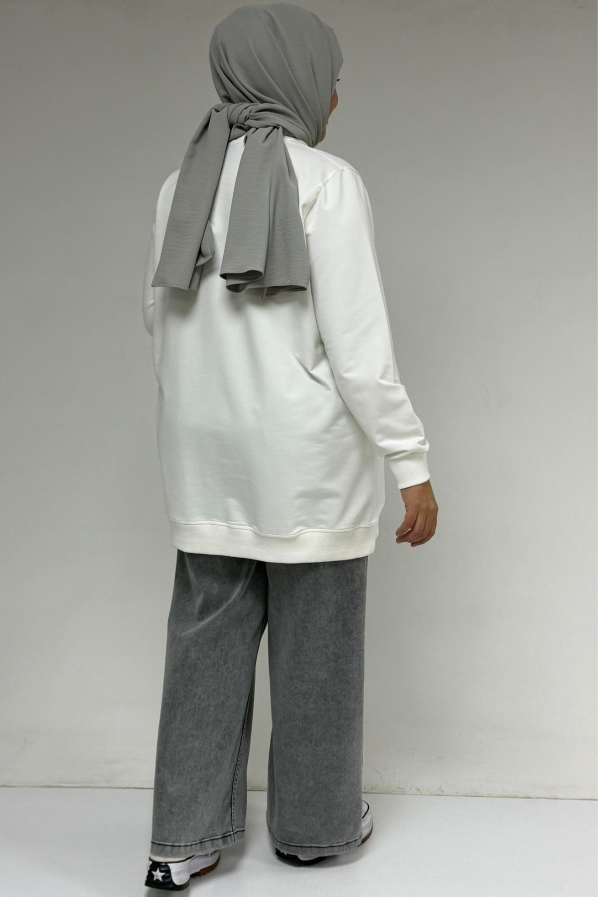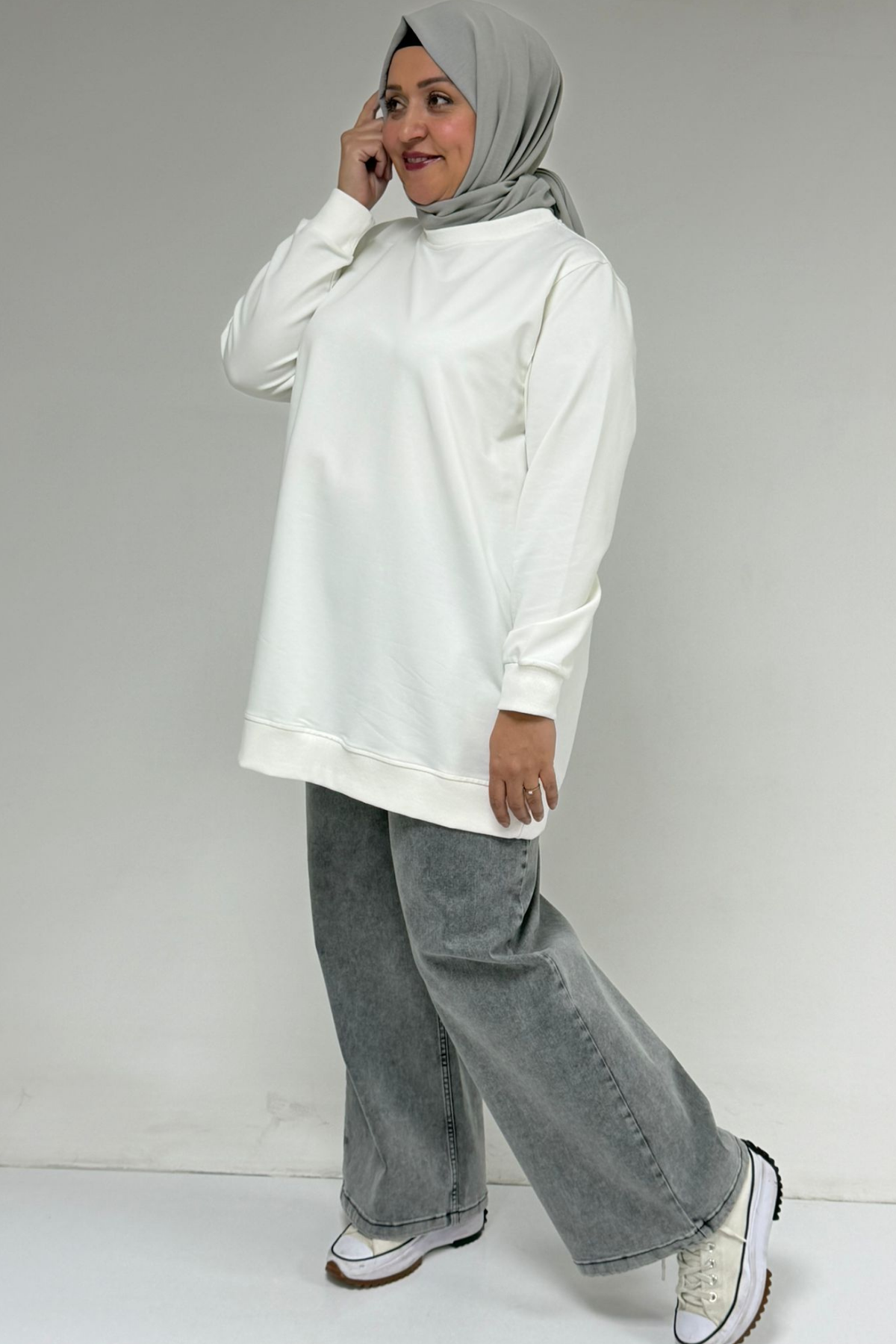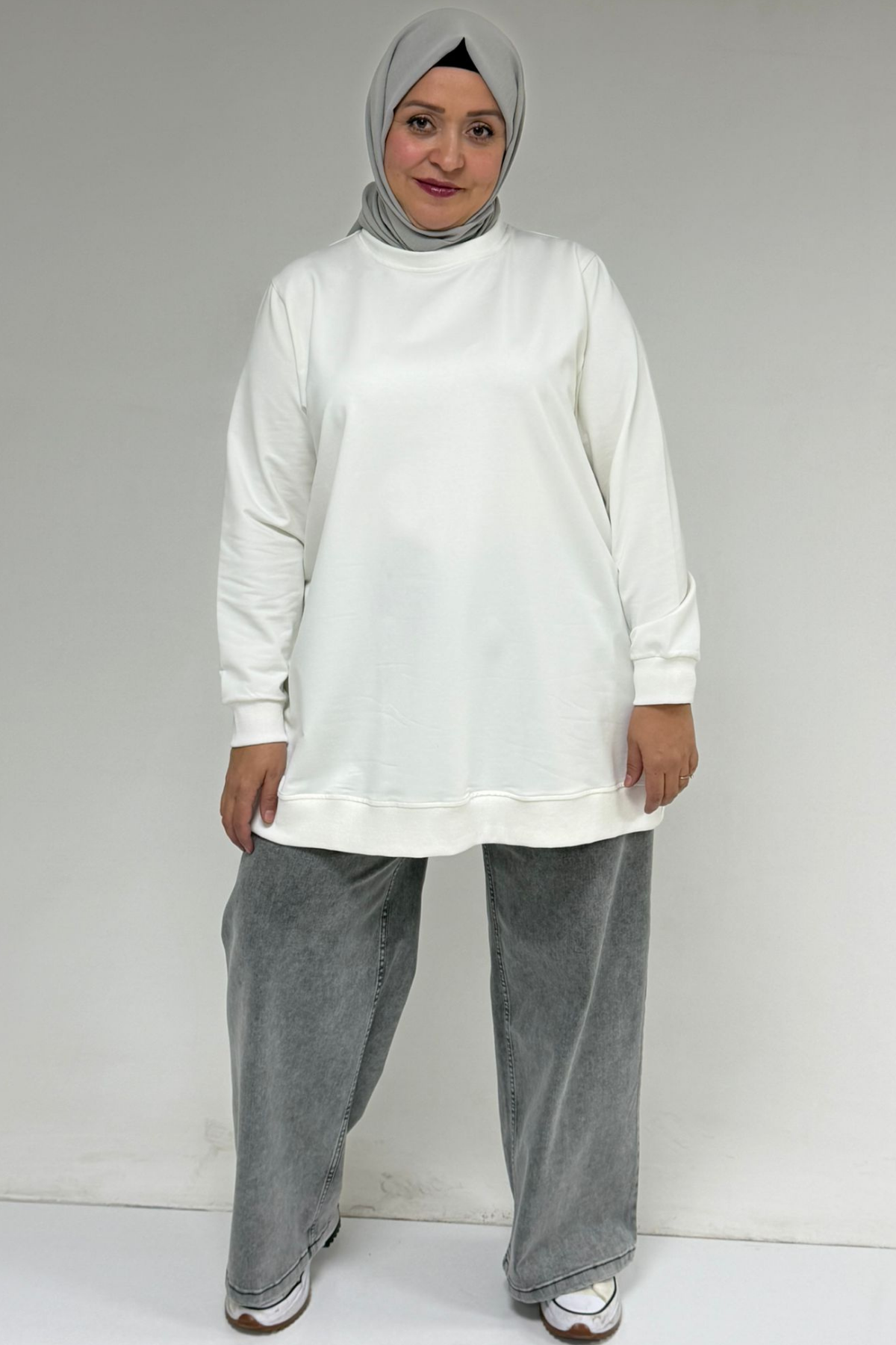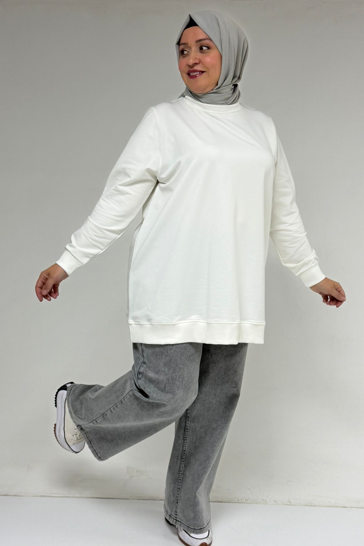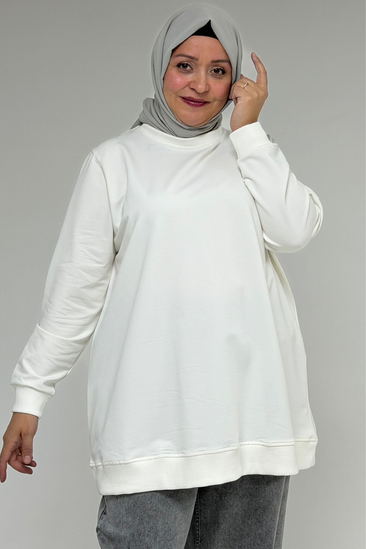 58170 Büyük Beden Eteği Kendi Kumaşından Ribanalı Kristal Tunik - Ekru