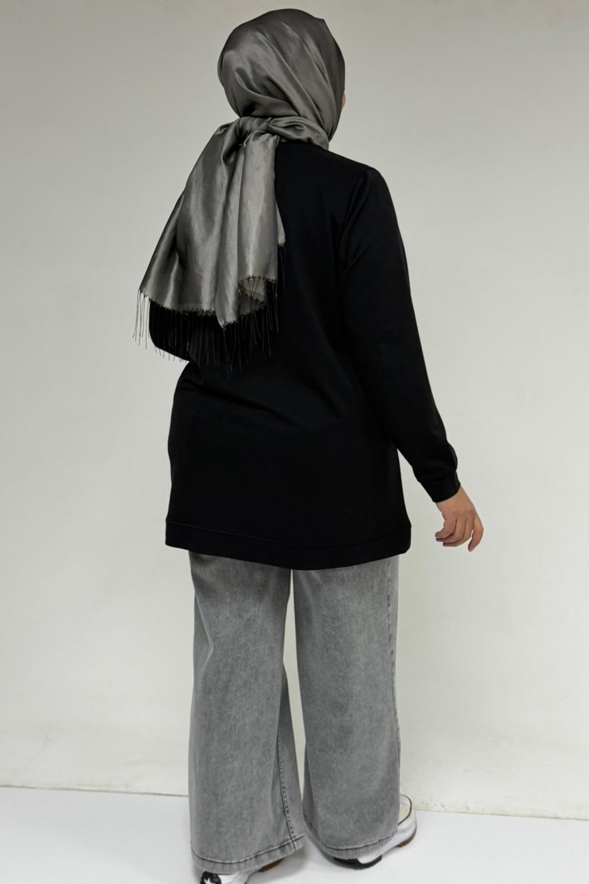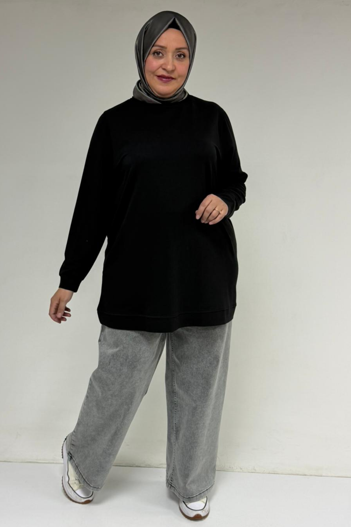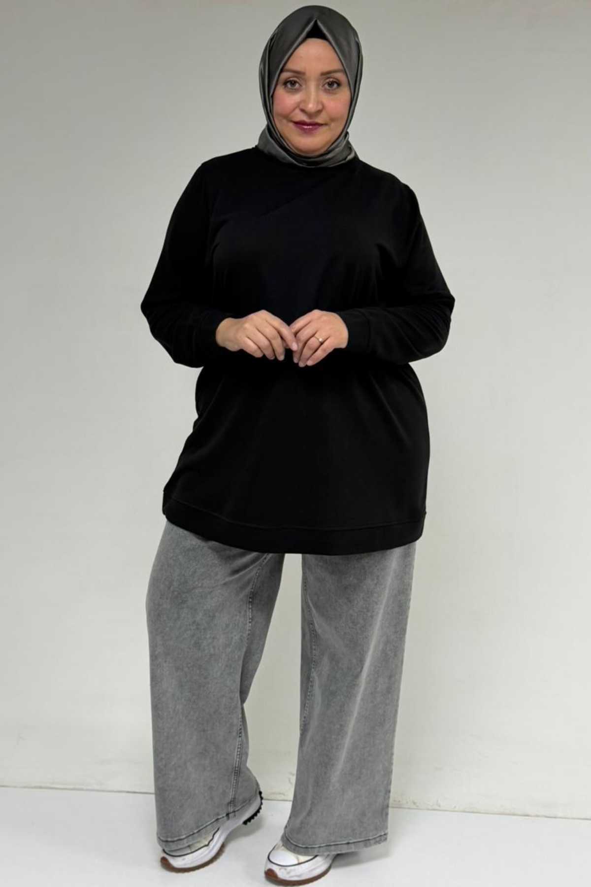 58170 Büyük Beden Eteği Kendi Kumaşından Ribanalı Kristal Tunik - Siyah