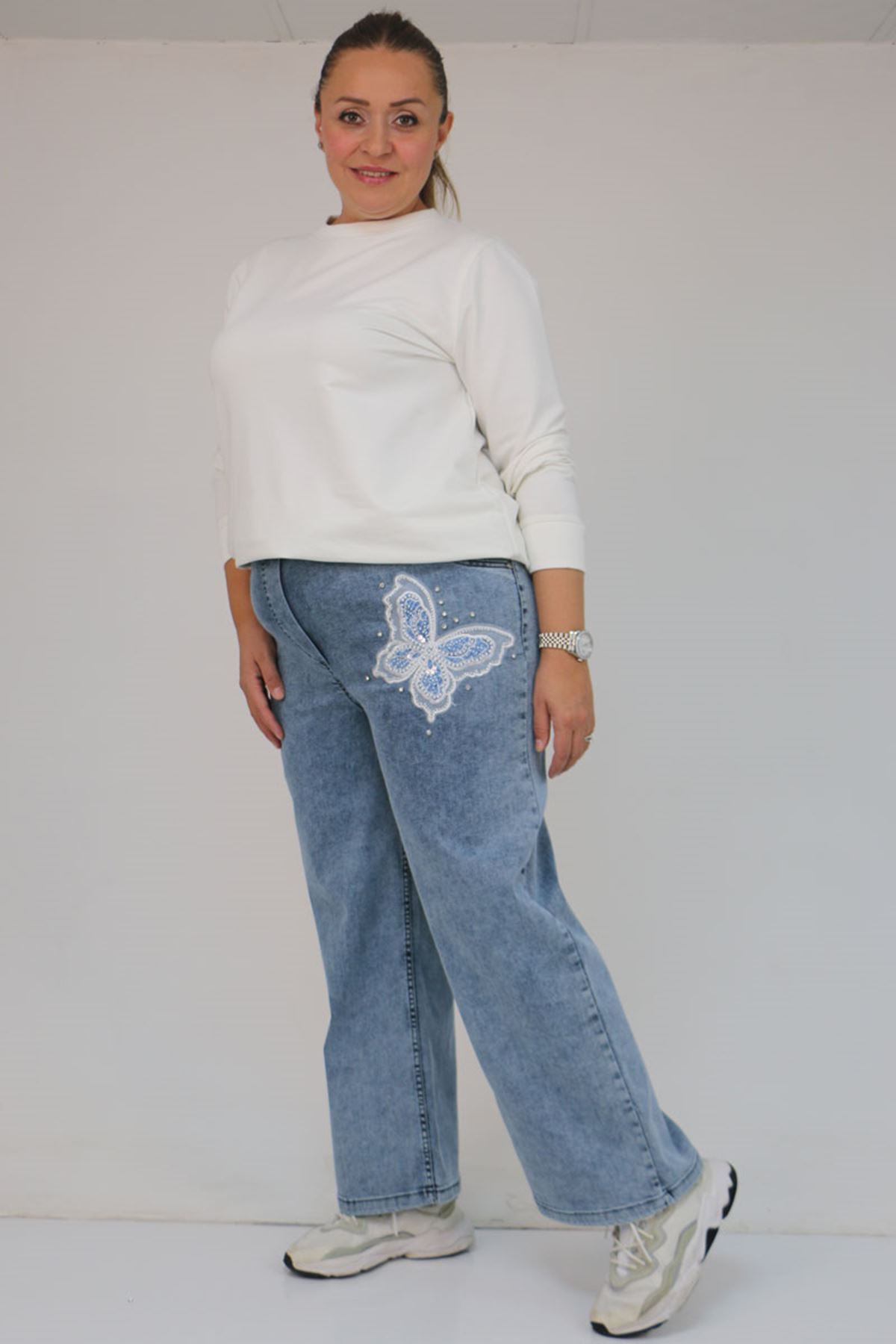 59035 Büyük Beden Kelebek Taş Detaylı Bol Paça Kot Pantolon - Mavi