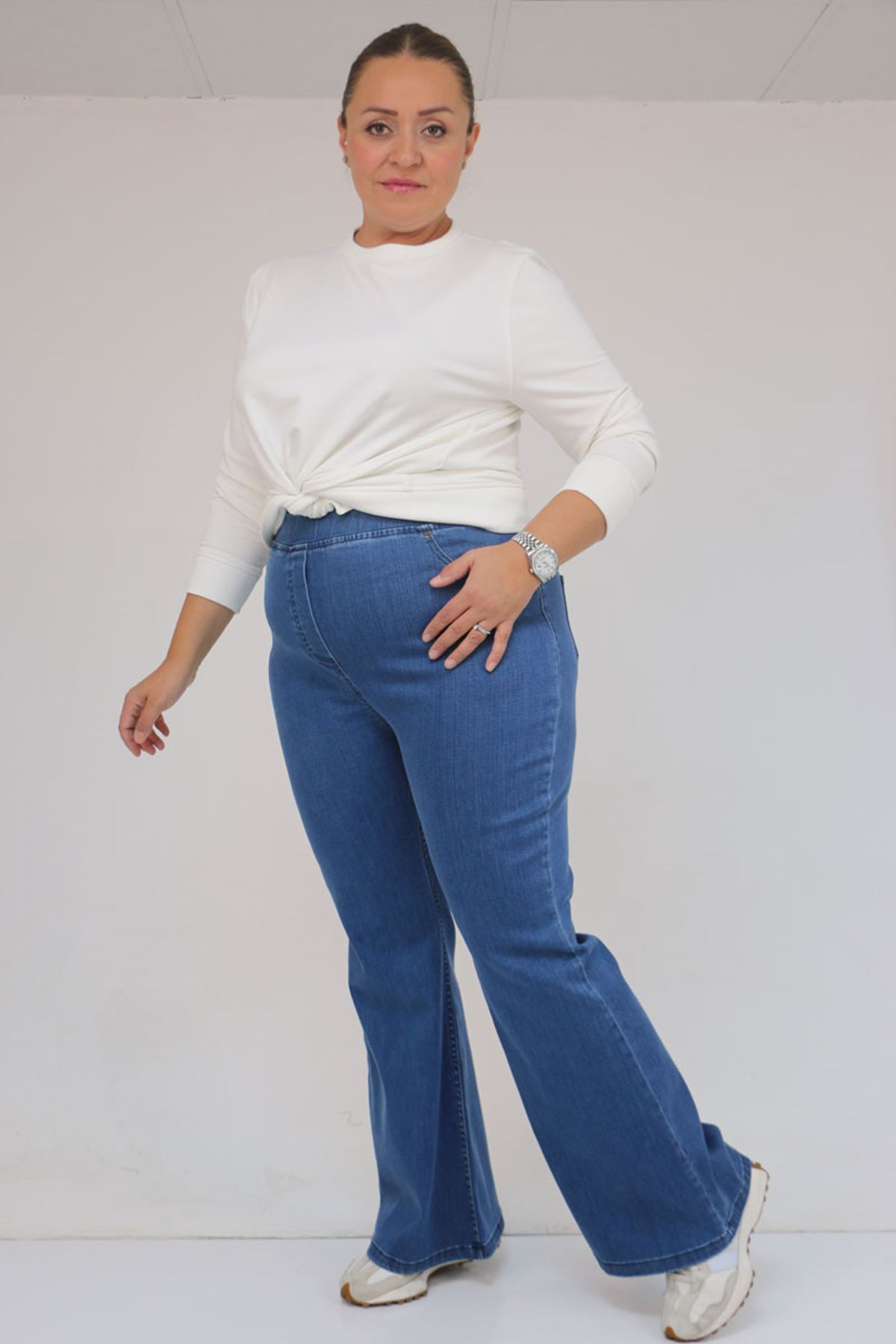 9137-18 Büyük Beden Beli Lastikli İspanyol Paça Kot Pantolon - Mavi