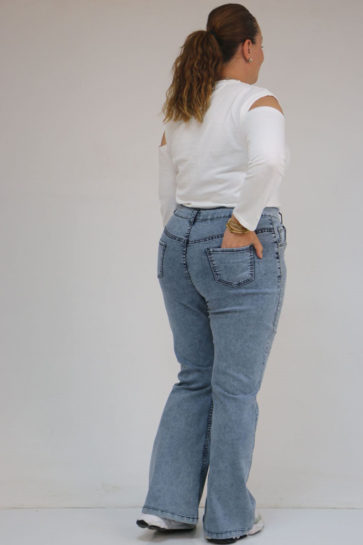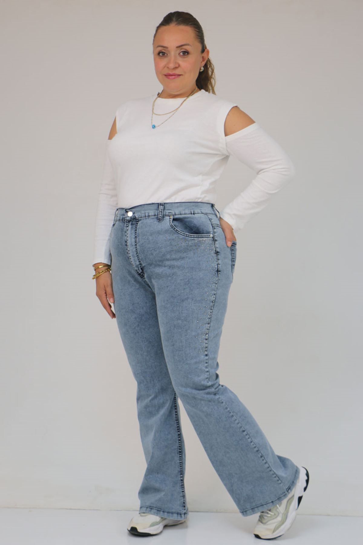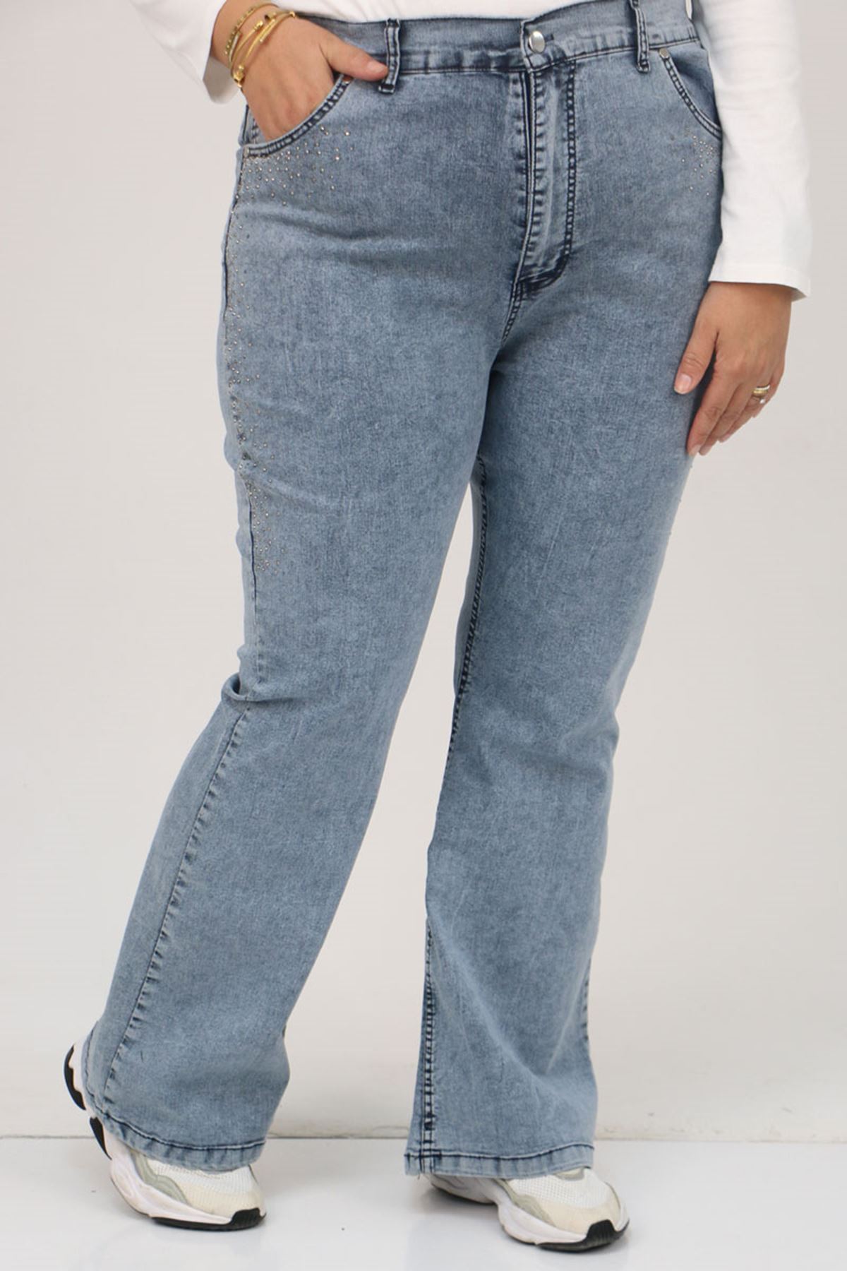 9204-1 Büyük Beden Kemerli Taş Detaylı Kot Pantolon - Kar Yıkama Mavi